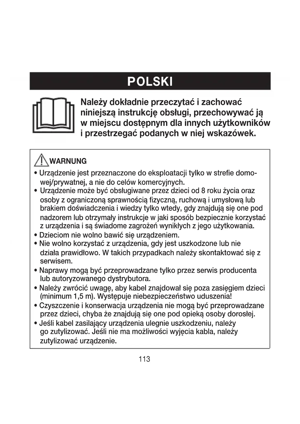 Urządzenie może być obsługiwane przez dzieci od 8 roku życia oraz osoby z ograniczoną sprawnością fizyczną, ruchową i umysłową lub brakiem doświadczenia i wiedzy tylko wtedy, gdy znajdują się one pod nadzorem lub otrzymały instrukcje w jaki sposób bezpiecznie korzystać z urządzenia i są świadome zagrożeń wynikłych z jego użytkowania.