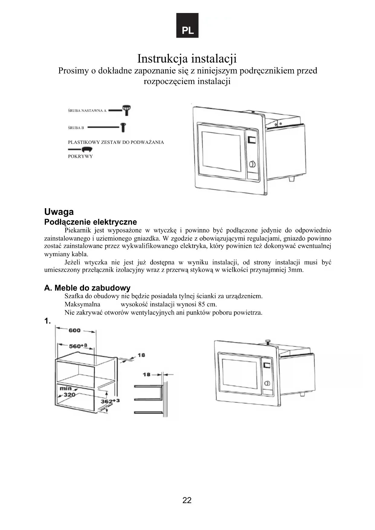 Uwaga Podłączenie elektryczne Piekarnik jest wyposażone w wtyczkę i powinno być podłączone jedynie do odpowiednio zainstalowanego i uziemionego gniazdka. W zgodzie z obowiązującymi regulacjami, gniazdo powinno zostać zainstalowane przez wykwalifikowanego elektryka, który powinien też dokonywać ewentualnej wymiany kabla. Jeżeli wtyczka nie jest już dostępna w wyniku instalacji, od strony instalacji musi być umieszczony przełącznik izolacyjny wraz z przerwą stykową w wielkości przynajmniej 3mm. A. Meble do zabudowy Szafka do obudowy nie będzie posiadała tylnej ścianki za urządzeniem. Maksymalna wysokość instalacji wynosi 85 cm. Nie zakrywać otworów wentylacyjnych ani punktów poboru powietrza.