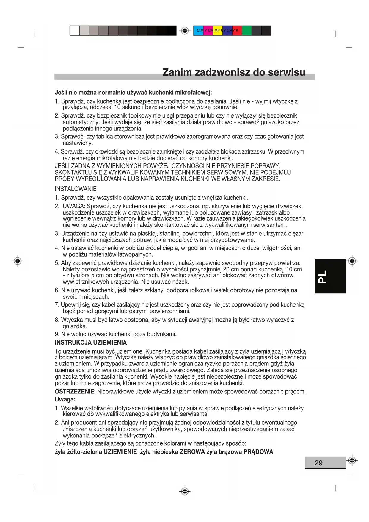zniszczenia kuchenki lub obrażeń użytkownika, spowodowanych nieprzestrzeganiem zasad wykonania podłączeń elektrycznych. Żyły tego kabla zasilającego są oznaczone kolorami w następujący sposób: żyła żółto-zielona UZIEMIENIE żyła niebieska ZEROWA żyła brązowa PRĄDOWAC M Y CM MY CY CMY K
