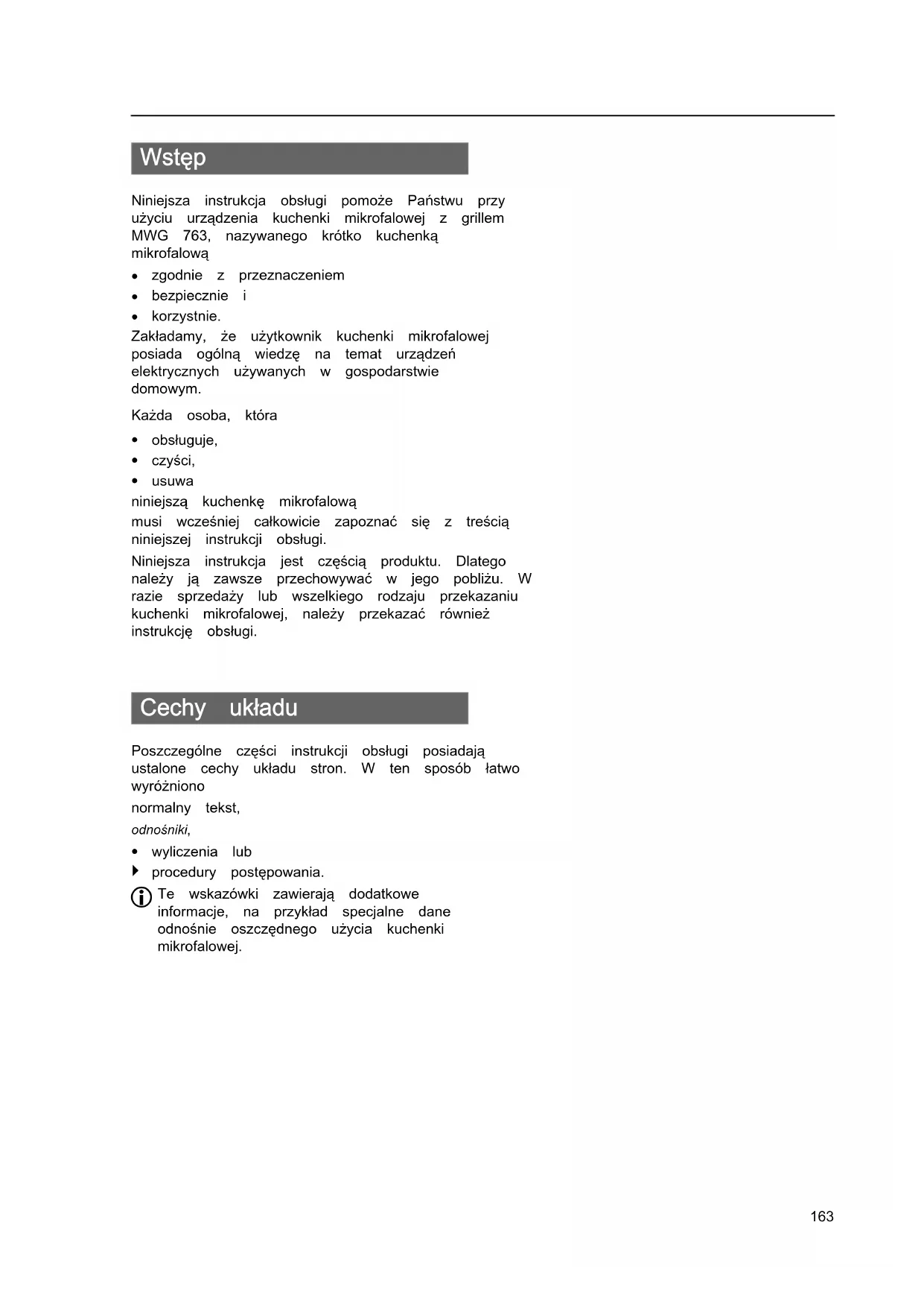 he environmentally-friendly disposal of machinery, electronic components, recyclable materials and other integral parts is regulated by national and regional laws. Please contact the responsible local authority for more detailed information regarding the disposal of the appliance. For questions regarding the materials used, please contact the manufacturer.163 Wstęp Niniejsza instrukcja obsługi pomoże Państwu przy użyciu urządzenia kuchenki mikrofalowej z grillem MWG 763, nazywanego krótko kuchenką mikrofalową