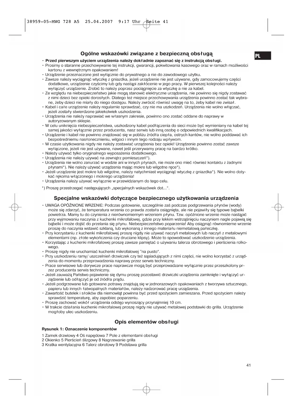 - W trakcie działania kuchenki mikrofalowej proszę nigdy nie używać metalowej podstawki do grilla. Urządzenie mogłoby ulec uszkodzeniu. Opis elementów obsługi Rysunek 1: Oznaczenie komponentów 1 Zamek drzwiowy 4 Oś napędowa 7 Pole z elementami obsługi 2 Okienko 5 Pierścień ślizgowy 8 Nagrzewanie grilla 3 Kratka wentylacyjna 6 Talerz obrotowy 9 Podstawa grilla 38959-05-MWG 728 A5 25.04.2007 9:17 Uhr Seite 4142