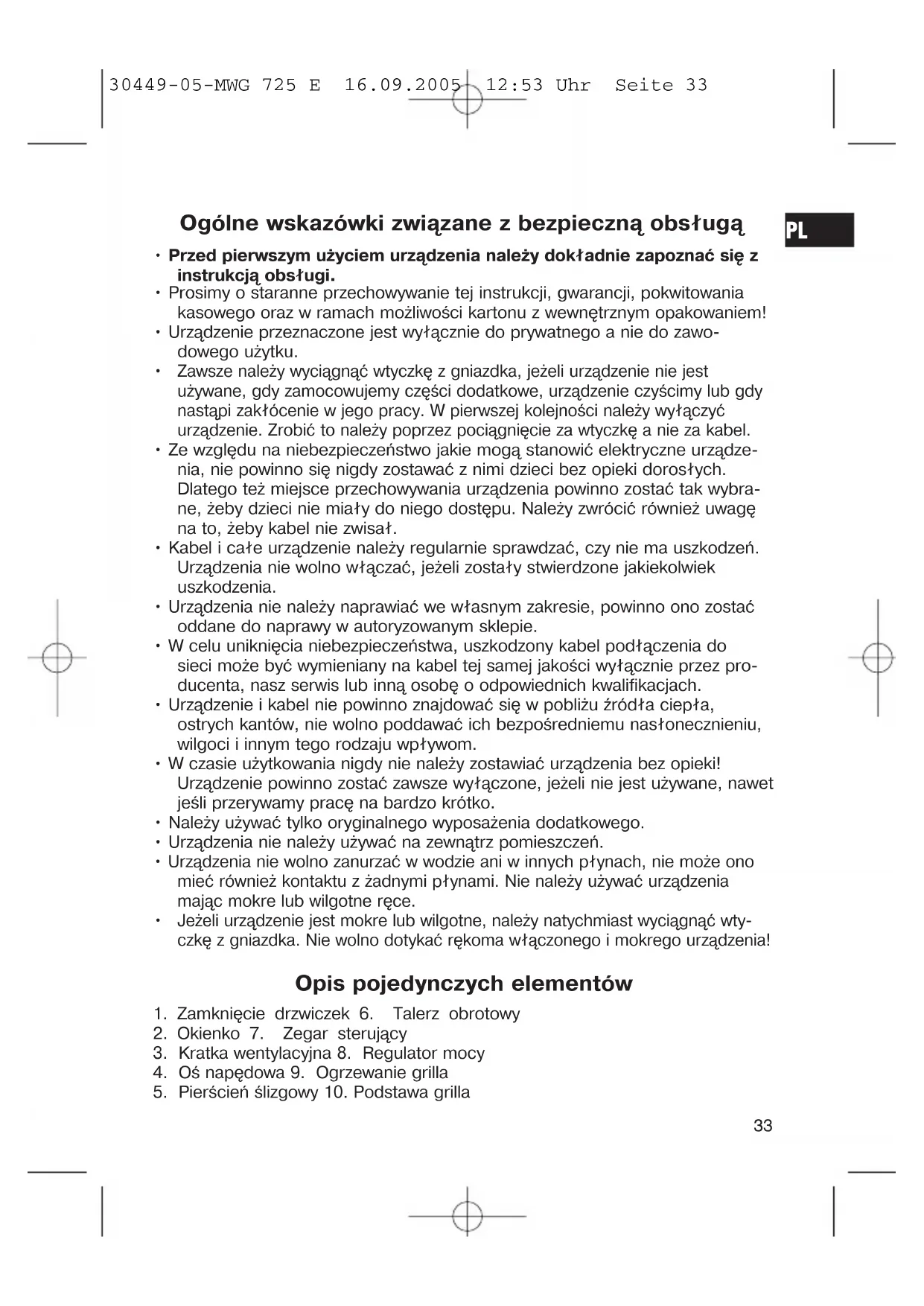 30449-05-MWG 725 E 16.09.2005 12:53 Uhr Seite 33Specjalne wskazówki dotyczące bezpiecznego użytkowania urządzenia