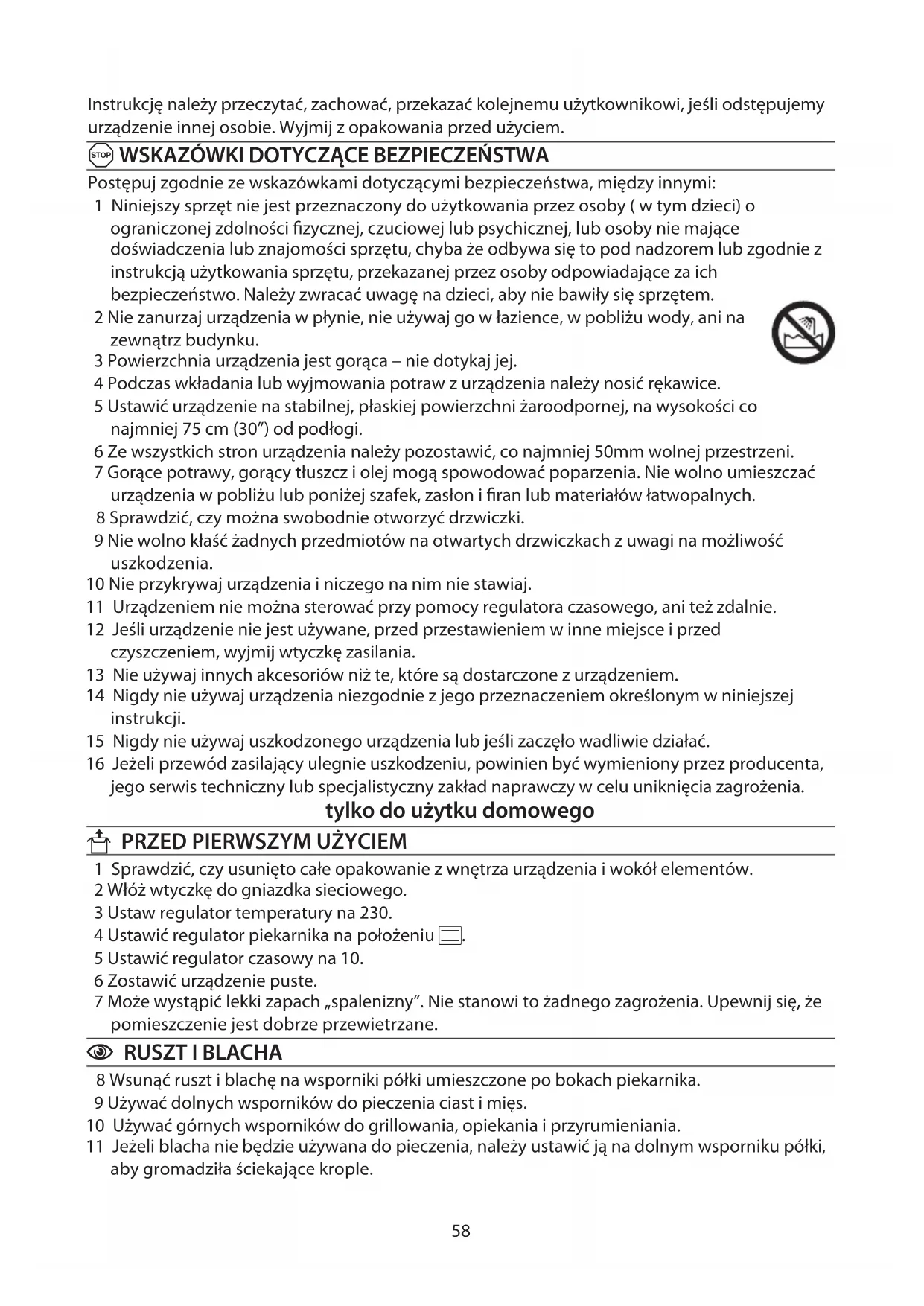 - Pri príprave zabalených potravín sa riaďte návodom na balení alebo nálepke. jedlo teplota jedlo teplota hovädzie 190-210 °C pečivo z lístkového cesta 190-210 °C chlieb 200-220 °C bravčové 190-210 °C jedlá s duseným mäsom 140-160 °C quiche – syrový nákyp 160-180 °C kura 190-210 °C výdatný ovocný koláč 140-160 °C ryba 170-190 °C maslové žemličky 190-220 °C jahňacie 190-210 °C piškótový koláč 160-180 °C snehové pusinky 90 -110 °C mliečny puding 140-160 °C „Yorkshire puding“ – koláčiky z palacinkového cesta pečené a podávané s mäsom 200-220 °C58 Instrukcję należy przeczytać, zachować, przekazać kolejnemu użytkownikowi, jeśli odstępujemy urządzenie innej osobie. Wyjmij z opakowania przed użyciem. A WSKAZÓWKI DOTYCZĄCE BEZPIECZEŃSTWA Postępuj zgodnie ze wskazówkami dotyczącymi bezpieczeństwa, między innymi: 1 Niniejszy sprzęt nie jest przeznaczony do użytkowania przez osoby ( w tym dzieci) o ograniczonej zdolności fizycznej, czuciowej lub psychicznej, lub osoby nie mające doświadczenia lub znajomości sprzętu, chyba że odbywa się to pod nadzorem lub zgodnie z instrukcją użytkowania sprzętu, przekazanej przez osoby odpowiadające za ich bezpieczeństwo. Należy zwracać uwagę na dzieci, aby nie bawiły się sprzętem. 2 Nie zanurzaj urządzenia w płynie, nie używaj go w łazience, w pobliżu wody, ani na zewnątrz budynku. 3 Powierzchnia urządzenia jest gorąca – nie dotykaj jej. 4 Podczas wkładania lub wyjmowania potraw z urządzenia należy nosić rękawice. 5 Ustawić urządzenie na stabilnej, płaskiej powierzchni żaroodpornej, na wysokości co najmniej 75 cm (30”) od podłogi. 6 Ze wszystkich stron urządzenia należy pozostawić, co najmniej 50mm wolnej przestrzeni. 7 Gorące potrawy, gorący tłuszcz i olej mogą spowodować poparzenia. Nie wolno umieszczać urządzenia w pobliżu lub poniżej szafek, zasłon i firan lub materiałów łatwopalnych. 8 Sprawdzić, czy można swobodnie otworzyć drzwiczki. 9 Nie wolno kłaść żadnych przedmiotów na otwartych drzwiczkach z uwagi na możliwość uszkodzenia. 10 Nie przykrywaj urządzenia i niczego na nim nie stawiaj. 11 Urządzeniem nie można sterować przy pomocy regulatora czasowego, ani też zdalnie. 12 Jeśli urządzenie nie jest używane, przed przestawieniem w inne miejsce i przed czyszczeniem, wyjmij wtyczkę zasilania. 13 Nie używaj innych akcesoriów niż te, które są dostarczone z urządzeniem. 14 Nigdy nie używaj urządzenia niezgodnie z jego przeznaczeniem określonym w niniejszej instrukcji. 15 Nigdy nie używaj uszkodzonego urządzenia lub jeśli zaczęło wadliwie działać. 16 Jeżeli przewód zasilający ulegnie uszkodzeniu, powinien być wymieniony przez producenta, jego serwis techniczny lub specjalistyczny zakład naprawczy w celu uniknięcia zagrożenia. tylko do użytku domowego