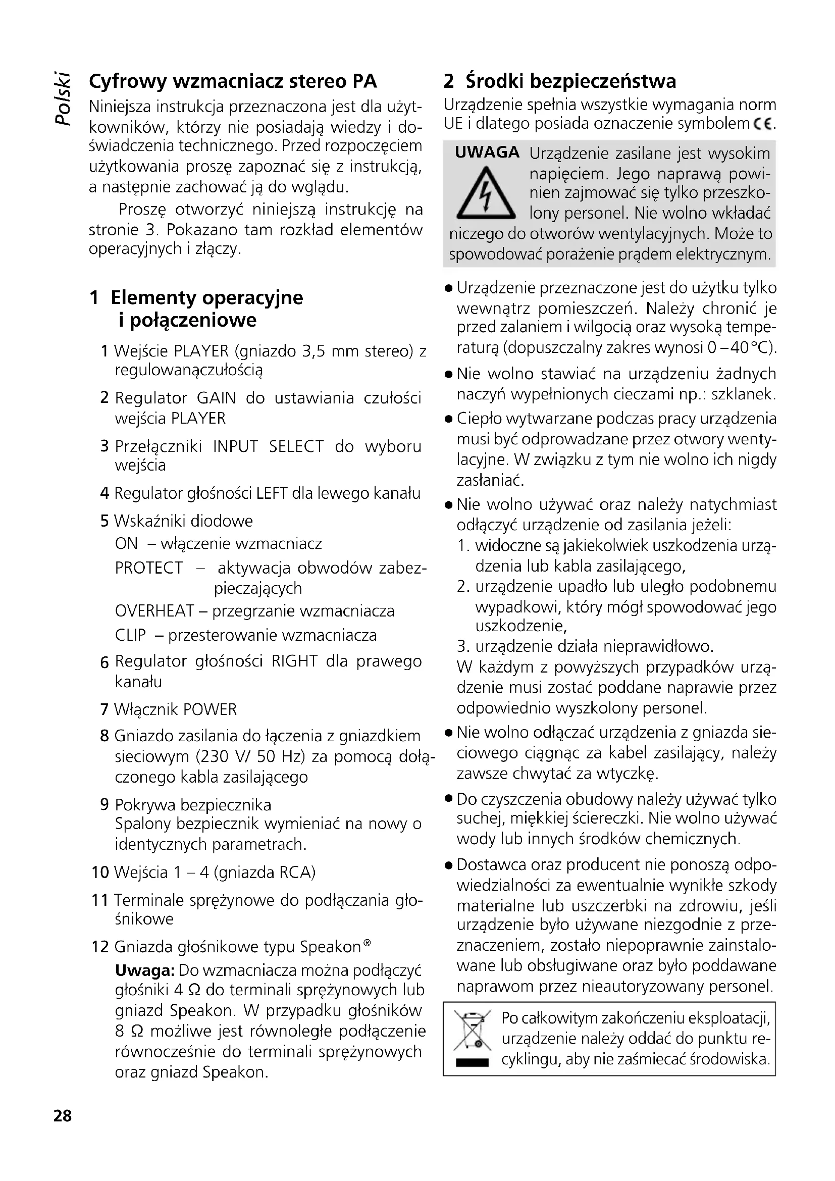 Uwaga: Do wzmacniacza można podłączyć głośniki 4 Ω do terminali sprężynowych lub gniazd Speakon. W przypadku głośników 8 Ω możliwe jest równoległe podłączenie równocześnie do terminali sprężynowych oraz gniazd Speakon. 2 Środki bezpieczeństwa Urządzenie spełnia wszystkie wymagania norm UE i dlatego posiada oznaczenie symbolem . UWAGA Urządzenie zasilane jest wysokim napięciem. Jego naprawą powi- nien zajmować się tylko przeszko- lony personel. Nie wolno wkładać niczego do otworów wentylacyjnych. Może to spowodować porażenie prądem elektrycznym.