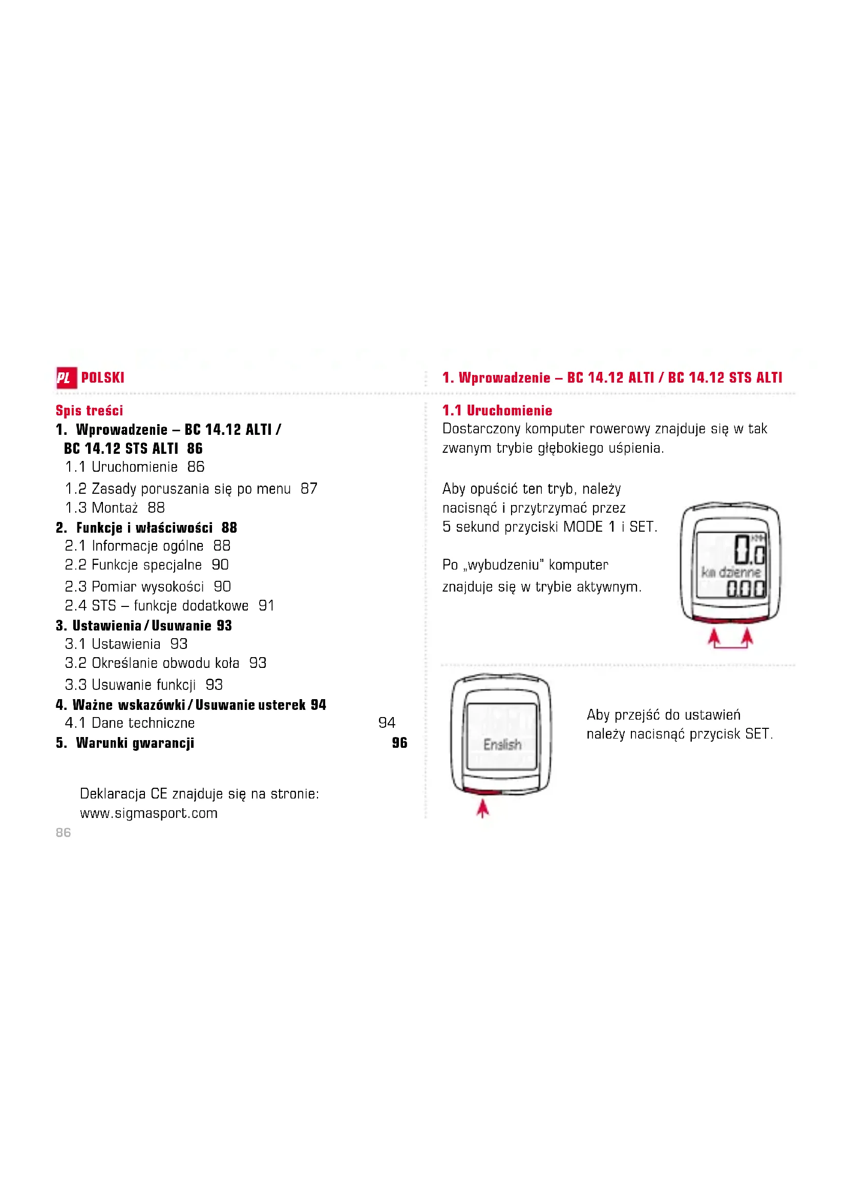 Dostarczony komputer rowerowy znajduje się w tak zwanym trybie głębokiego uśpienia. Aby opuścić ten tryb, należy nacisnąć i przytrzymać przez 5 sekund przyciski MODE 1 i SET. Po „wybudzeniu” komputer znajduje się w trybie aktywnym. Aby przejść do ustawień należy nacisnąć przycisk SET.87