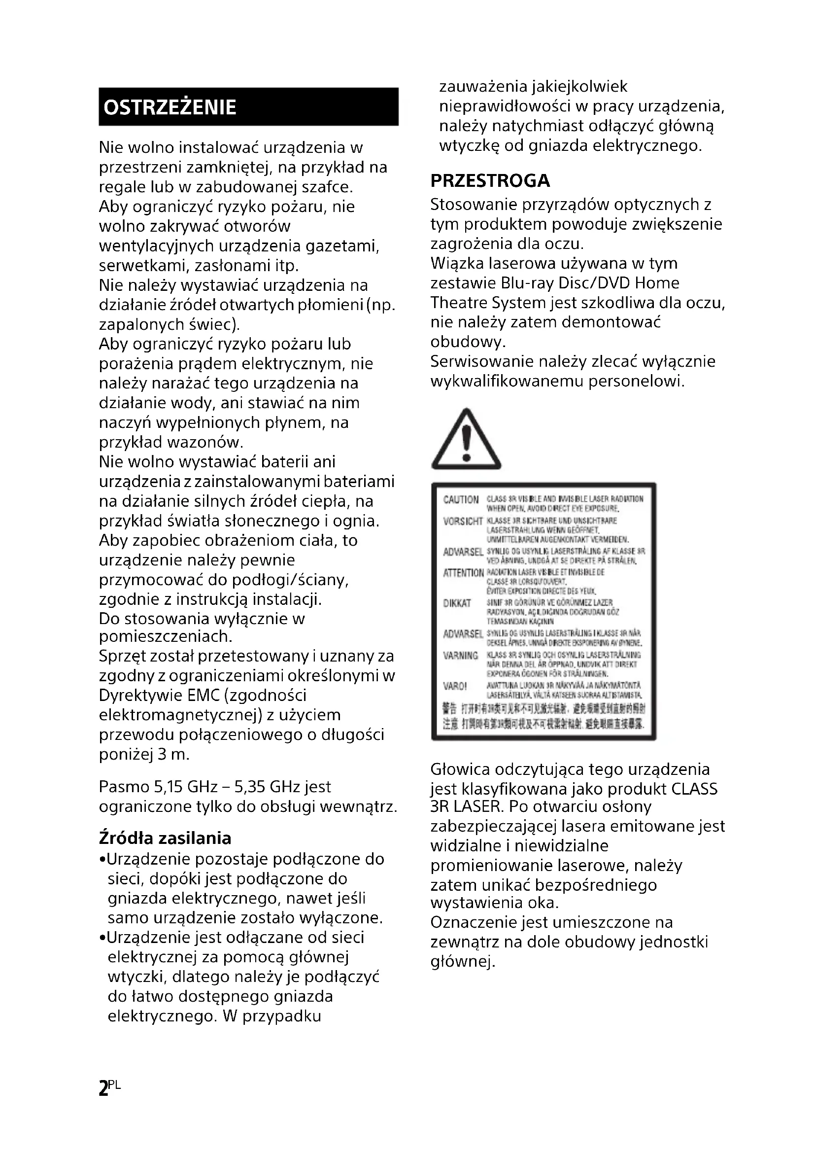 - Urządzenie jest odłączane od sieci elektrycznej za pomocą głównej wtyczki, dlatego należy je podłączyć do łatwo dostępnego gniazda elektrycznego. W przypadku zauważenia jakiejkolwiek nieprawidłowości w pracy urządzenia, należy natychmiast odłączyć główną wtyczkę od gniazda elektrycznego. PRZESTROGA Stosowanie przyrządów optycznych z tym produktem powoduje zwiększenie zagrożenia dla oczu. Wiązka laserowa używana w tym zestawie Blu-ray Disc/DVD Home Theatre System jest szkodliwa dla oczu, nie należy zatem demontować obudowy. Serwisowanie należy zlecać wyłącznie wykwalifikowanemu personelowi. Głowica odczytująca tego urządzenia jest klasyfikowana jako produkt CLASS 3R LASER. Po otwarciu osłony zabezpieczającej lasera emitowane jest widzialne i niewidzialne promieniowanie laserowe, należy zatem unikać bezpośredniego wystawienia oka. Oznaczenie jest umieszczone na zewnątrz na dole obudowy jednostki głównej. OSTRZEŻENIED:\NORM'S JOB\SONY HA\SO160050\BDV-N9200_7200_5200_Ref (PMRF 05)\4485833161_GBFRESDENLITPL (CEK)\PL\020REG.fm masterpage: Right