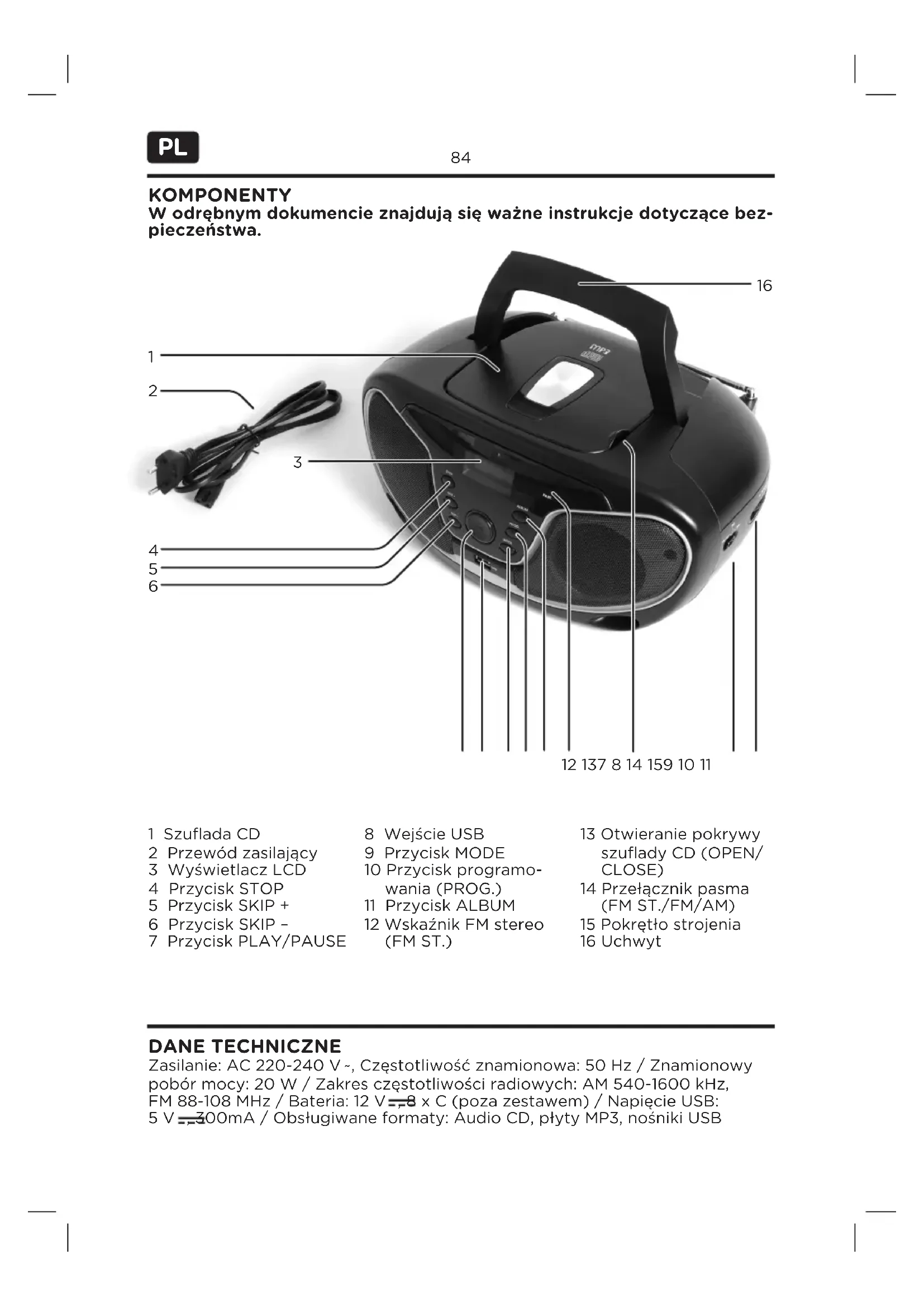 KOMPONENTY 1 Szuflada CD 2 Przewód zasilający 3 Wyświetlacz LCD 4 Przycisk STOP 5 Przycisk SKIP + 6 Przycisk SKIP – 7 Przycisk PLAY/PAUSE 8 Wejście USB 9 Przycisk MODE 10 Przycisk programo- wania (PROG.) 11 Przycisk ALBUM 12 Wskaźnik FM stereo (FM ST.) 13 Otwieranie pokrywy szuflady CD (OPEN/ CLOSE) 14 Przełącznik pasma (FM ST./FM/AM) 15 Pokrętło strojenia 16 Uchwyt Zasilanie: AC 220-240 V