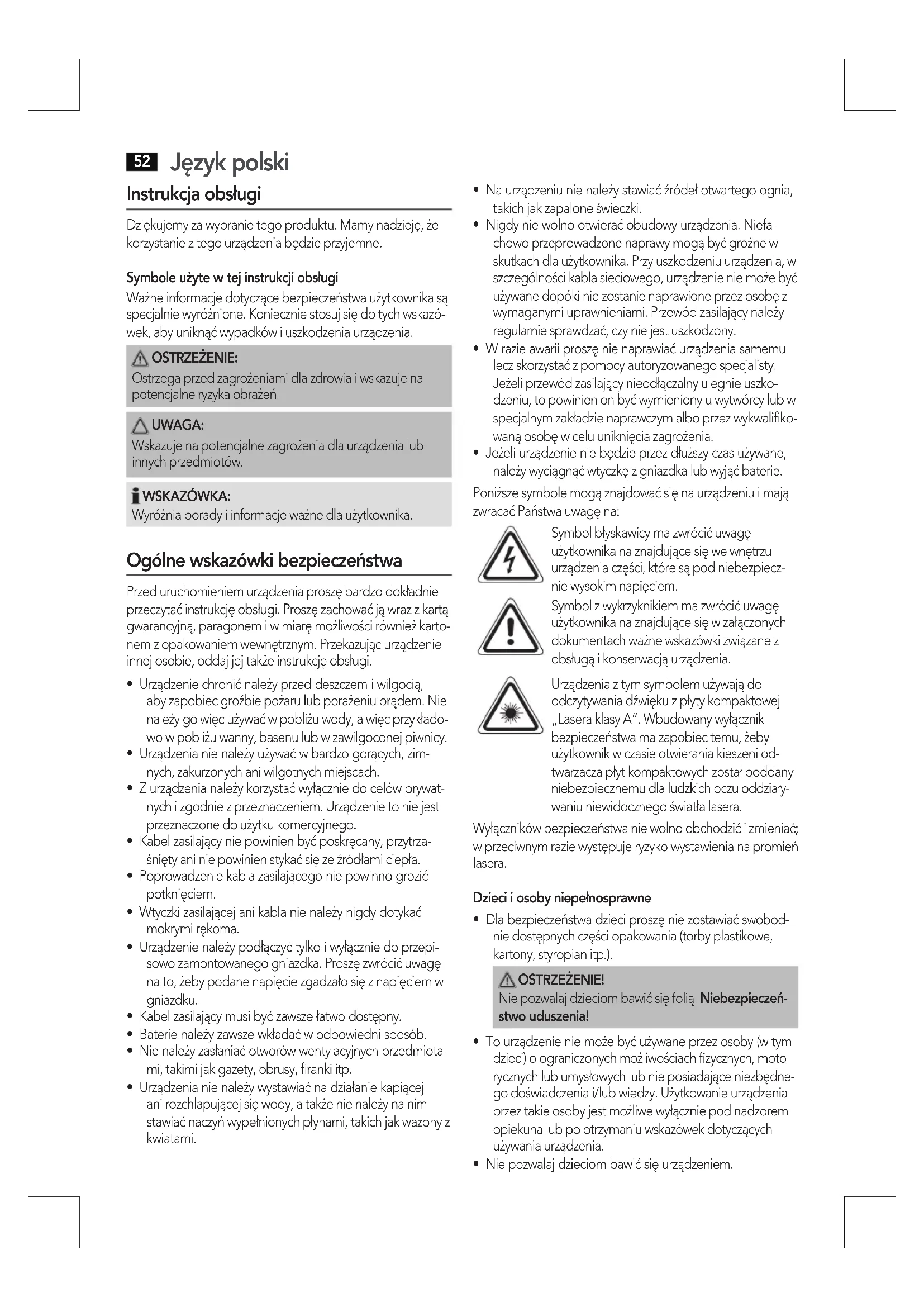 - Jeżeli urządzenie nie będzie przez dłuższy czas używane, należy wyciągnąć wtyczkę z gniazdka lub wyjąć baterie. Poniższe symbole mogą znajdować się na urządzeniu i mają zwracać Państwa uwagę na: Symbol błyskawicy ma zwrócić uwagę użytkownika na znajdujące się we wnętrzu urządzenia części, które są pod niebezpiecz- nie wysokim napięciem. Symbol z wykrzyknikiem ma zwrócić uwagę użytkownika na znajdujące się w załączonych dokumentach ważne wskazówki związane z obsługą i konserwacją urządzenia. Urządzenia z tym symbolem używają do odczytywania dźwięku z płyty kompaktowej „Lasera klasy A“. Wbudowany wyłącznik bezpieczeństwa ma zapobiec temu, żeby użytkownik w czasie otwierania kieszeni od- twarzacza płyt kompaktowych został poddany niebezpiecznemu dla ludzkich oczu oddziały- waniu niewidocznego światła lasera. Wyłączników bezpieczeństwa nie wolno obchodzić i zmieniać; w przeciwnym razie występuje ryzyko wystawienia na promień lasera. Dzieci i osoby niepełnosprawne