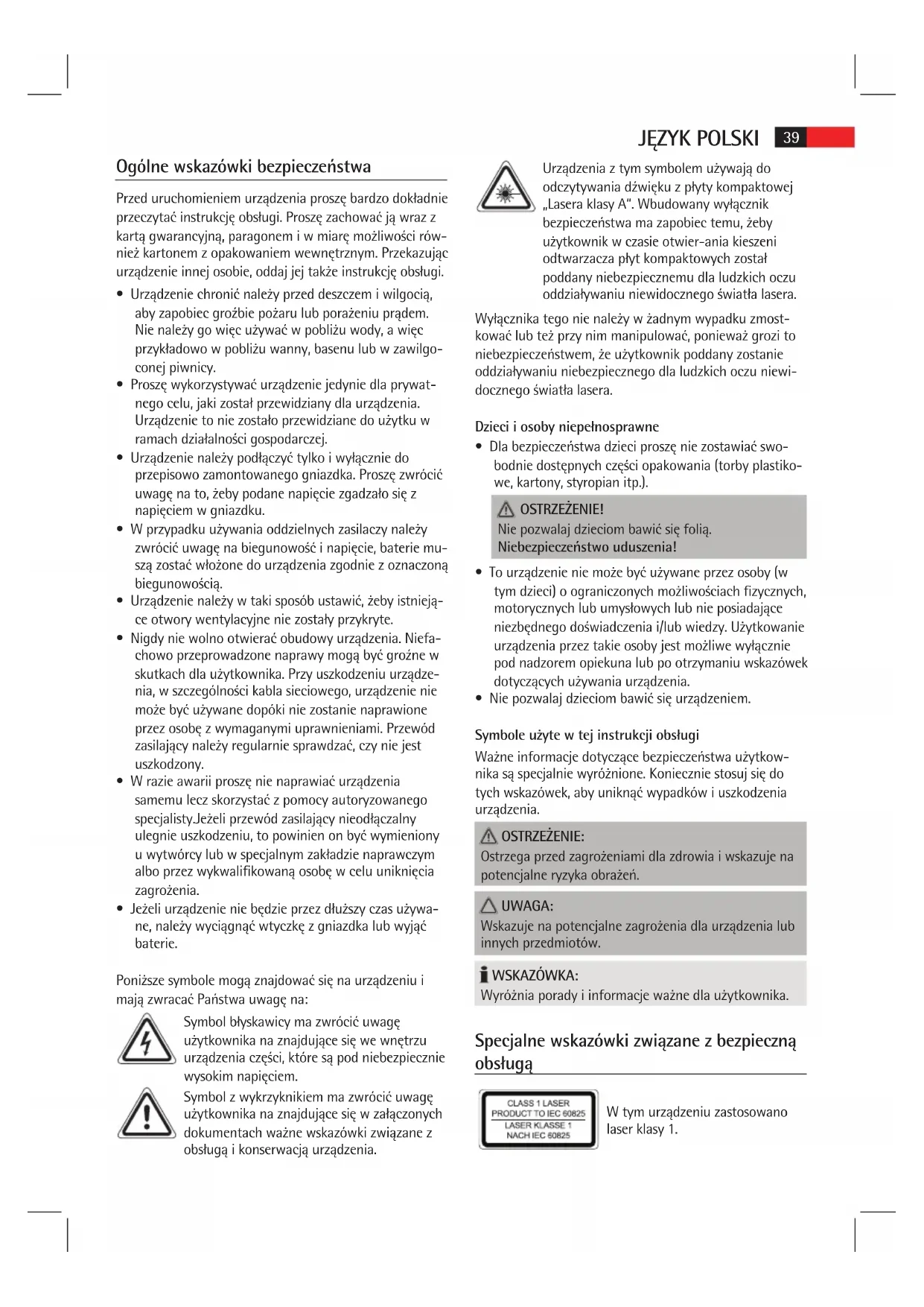 - Jeżeli urządzenie nie będzie przez dłuższy czas używa- ne, należy wyciągnąć wtyczkę z gniazdka lub wyjąć baterie. Poniższe symbole mogą znajdować się na urządzeniu i mają zwracać Państwa uwagę na: Symbol błyskawicy ma zwrócić uwagę użytkownika na znajdujące się we wnętrzu urządzenia części, które są pod niebezpiecznie wysokim napięciem. Symbol z wykrzyknikiem ma zwrócić uwagę użytkownika na znajdujące się w załączonych dokumentach ważne wskazówki związane z obsługą i konserwacją urządzenia. Urządzenia z tym symbolem używają do odczytywania dźwięku z płyty kompaktowej „Lasera klasy A“. Wbudowany wyłącznik bezpieczeństwa ma zapobiec temu, żeby użytkownik w czasie otwier-ania kieszeni odtwarzacza płyt kompaktowych został poddany niebezpiecznemu dla ludzkich oczu oddziaływaniu niewidocznego światła lasera. Wyłącznika tego nie należy w żadnym wypadku zmost- kować lub też przy nim manipulować, ponieważ grozi to niebezpieczeństwem, że użytkownik poddany zostanie oddziaływaniu niebezpiecznego dla ludzkich oczu niewi- docznego światła lasera. Dzieci i osoby niepełnosprawne