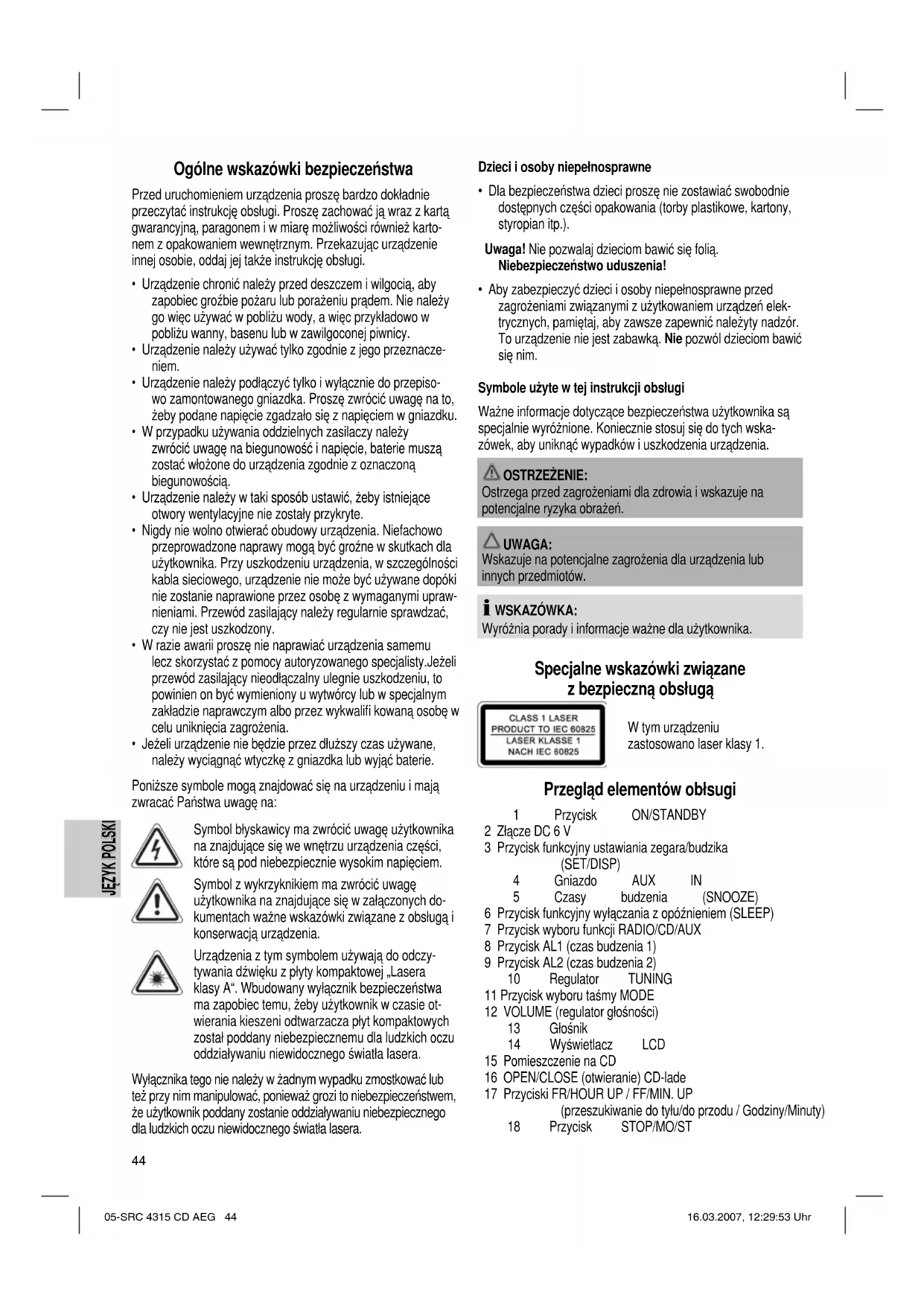 - Aby zabezpieczyć dzieci i osoby niepełnosprawne przed zagrożeniami związanymi z użytkowaniem urządzeń elek- trycznych, pamiętaj, aby zawsze zapewnić należyty nadzór. To urządzenie nie jest zabawką. Nie pozwól dzieciom bawić się nim. Symbole użyte w tej instrukcji obsługi Ważne informacje dotyczące bezpieczeństwa użytkownika są specjalnie wyróżnione. Koniecznie stosuj się do tych wska- zówek, aby uniknąć wypadków i uszkodzenia urządzenia. OSTRZEŻENIE: Ostrzega przed zagrożeniami dla zdrowia i wskazuje na potencjalne ryzyka obrażeń. UWAGA: Wskazuje na potencjalne zagrożenia dla urządzenia lub innych przedmiotów. WSKAZÓWKA: Wyróżnia porady i informacje ważne dla użytkownika. Specjalne wskazówki związane z bezpieczną obsługą W tym urządzeniu zastosowano laser klasy 1. Przegląd elementów obłsugi 1 Przycisk ON/STANDBY 2 Złącze DC 6 V 3 Przycisk funkcyjny ustawiania zegara/budzika (SET/DISP) 4 Gniazdo AUX IN 5 Czasy budzenia (SNOOZE) 6 Przycisk funkcyjny wyłączania z opóźnieniem (SLEEP) 7 Przycisk wyboru funkcji RADIO/CD/AUX 8 Przycisk AL1 (czas budzenia 1) 9 Przycisk AL2 (czas budzenia 2) 10 Regulator TUNING 11 Przycisk wyboru taśmy MODE 12 VOLUME (regulator głośności) 13 Głośnik 14 Wyświetlacz LCD 15 Pomieszczenie na CD 16 OPEN/CLOSE (otwieranie) CD-lade 17 Przyciski FR/HOUR UP / FF/MIN. UP (prze szukiwanie do tyłu/do przodu / Godziny/Minuty) 18 Przycisk STOP/MO/ST 05-SRC 4315 CD AEG 44 16.03.2007, 12:29:53 Uhr45