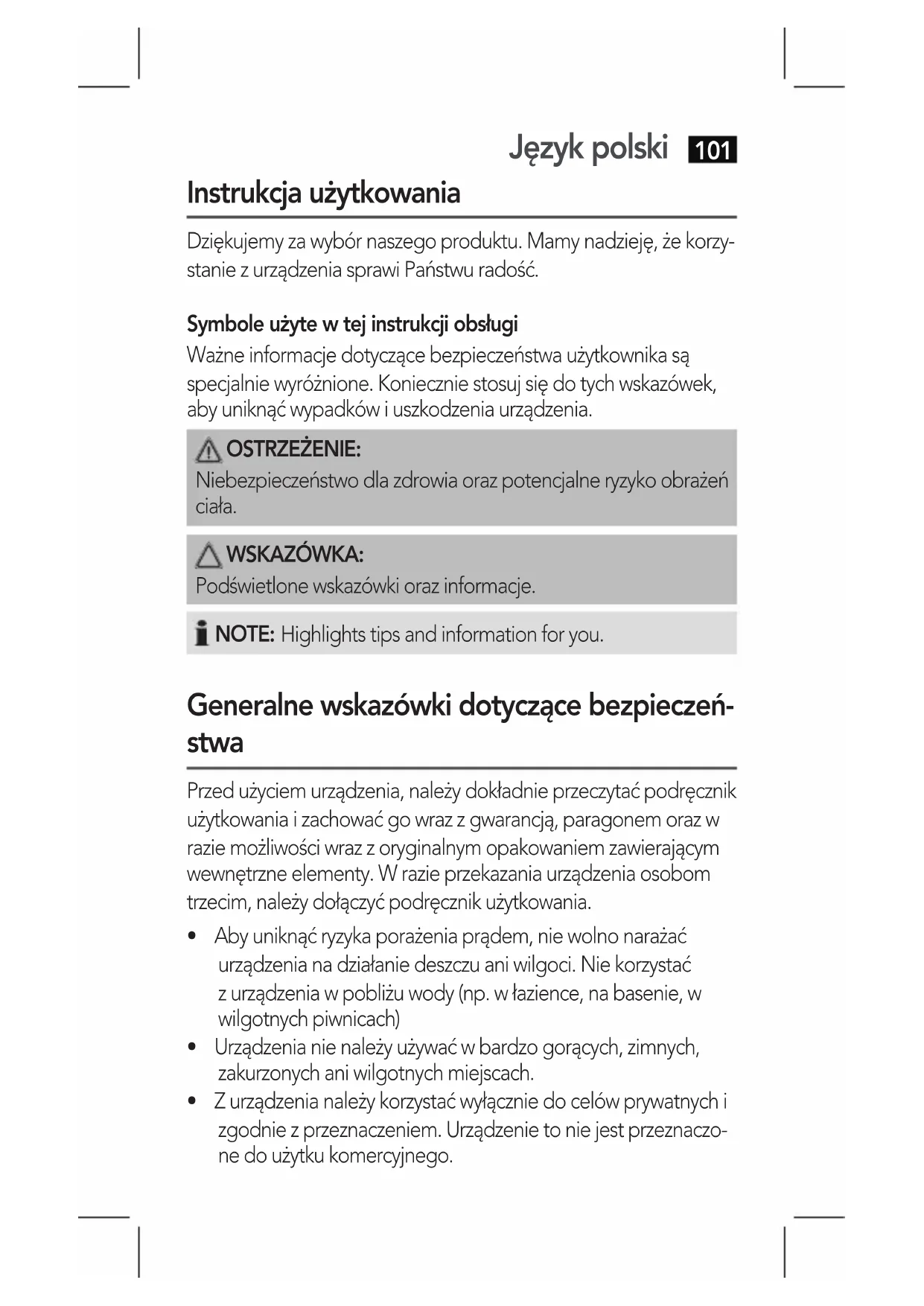 Instrukcja użytkowania Dziękujemy za wybór naszego produktu. Mamy nadzieję, że korzy- stanie z urządzenia sprawi Państwu radość. Symbole użyte w tej instrukcji obsługi Ważne informacje dotyczące bezpieczeństwa użytkownika są specjalnie wyróżnione. Koniecznie stosuj się do tych wskazówek, aby uniknąć wypadków i uszkodzenia urządzenia. OSTRZEŻENIE: Niebezpieczeństwo dla zdrowia oraz potencjalne ryzyko obrażeń ciała. WSKAZÓWKA: Podświetlone wskazówki oraz informacje. NOTE: Highlights tips and information for you. Generalne wskazówki dotyczące bezpieczeń- stwa Przed użyciem urządzenia, należy dokładnie przeczytać podręcznik użytkowania i zachować go wraz z gwarancją, paragonem oraz w razie możliwości wraz z oryginalnym opakowaniem zawierającym wewnętrzne elementy. W razie przekazania urządzenia osobom trzecim, należy dołączyć podręcznik użytkowania.