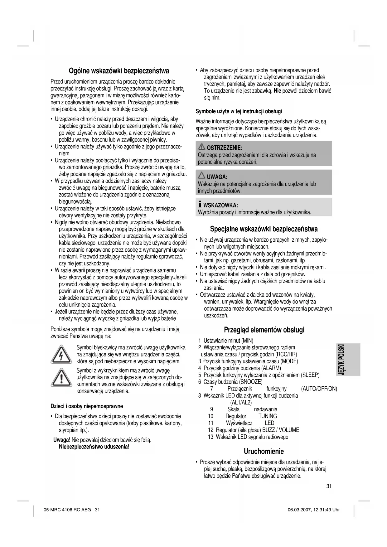 - Proszę nie wsadzać urządzenia do wody. Dane techniczne Model: ................................................................. MRC 4106 RC Napięcie zasilające:............................................... 230 V, 50 Hz Pobór mocy: ........................................................................ 3 W Bateria rezerwowa:......................................2 x 1,5V „R03/AAA“ Zakres częstotliwości:...........................UKW / FM 88 ~ 108 MH Niniejsze urządzenie odpowiada wymaganiom normy bezpieczeństwa użytkowania oraz spełnia wymagania dyrekty- wy niskonapięciowej i kompatybilności elektromagnetycznej. Zastrzega się prawo do zmian technicznych! WARUNKI GWARANCJI Przyznajemy 24 miesiące gwarancji na produkt licząc od daty zakupu. W tym okresie będziemy bezpłatnie usuwać w terminie 14 dni od daty dostarczenia wadliwego sprzętu z kartą gwarancyjną do miejsca zakupu wszystkie uszkodzenia powstałe w tym urządzeniu na skutek wady materiałów lub wadliwego wyko- nania, naprawiając oraz wymieniając wadliwe części lub (jeśli uznamy za stosowne) wymieniając całe urządzenie na nowe. Sprzęt do naprawy powinien być dostarczony w komplecie wraz z dowodem zakupu oraz z ważną kartą gwarancyjną do sprzedawcy w miarę możliwości w oryginalnym opakowaniu lub innym odpowiednim dla zabezpieczenia przed uszkodze- niem. W razie braku kompletnego opakowania fabrycznego, ryzyko uszkodzenia sprzętu podczas transportu do i z miejsca zakupu ponosi reklamujący. Naprawa gwarancyjna nie dotyczy czynności przewidzianych w instrukcji obsługi, do wykonania których zobowiązany jest użytkownik we własnym zakresie i na własny koszt. Gwarancja nie obejmuje: