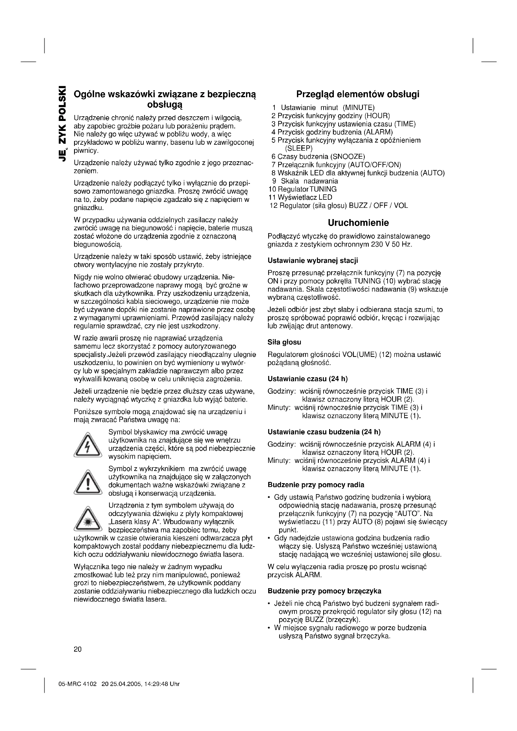 Ogólne wskazówki związane z bezpieczną obsługą Urządzenie chronić należy przed deszczem i wilgocią, aby zapobiec groźbie pożaru lub porażeniu prądem. Nie należy go więc używać w pobliżu wody, a więc przykładowo w pobliżu wanny, basenu lub w zawilgoconej piwnicy. Urządzenie należy używać tylko zgodnie z jego przeznac- zeniem. Urządzenie należy podłączyć tylko i wyłącznie do przepi- sowo zamontowanego gniazdka. Proszę zwrócić uwagę na to, żeby podane napięcie zgadzało się z napięciem w gniazdku. W przypadku używania oddzielnych zasilaczy należy zwrócić uwagę na biegunowość i napięcie, baterie muszą zostać włożone do urządzenia zgodnie z oznaczoną biegunowością. Urządzenie należy w taki sposób ustawić, żeby istniejące otwory wentylacyjne nie zostały przykryte. Nigdy nie wolno otwierać obudowy urządzenia. Nie- fachowo przeprowadzone naprawy mogą być groźne w skutkach dla użytkownika. Przy uszkodzeniu urządzenia, w szczególności kabla sieciowego, urządzenie nie może być używane dopóki nie zostanie naprawione przez osobę z wymaganymi uprawnieniami. Przewód zasilający należy regularnie sprawdzać, czy nie jest uszkodzony. W razie awarii proszę nie naprawiać urządzenia samemu lecz skorzystać z pomocy autoryzowanego specjalisty.Jeżeli przewód zasilający nieodłączalny ulegnie uszkodzeniu, to powinien on być wymieniony u wytwór- cy lub w specjalnym zakładzie naprawczym albo przez wykwalifi kowaną osobę w celu uniknięcia zagrożenia. Jeżeli urządzenie nie będzie przez dłuższy czas używane, należy wyciągnąć wtyczkę z gniazdka lub wyjąć baterie. Poniższe symbole mogą znajdować się na urządzeniu i mają zwracać Państwa uwagę na: Symbol błyskawicy ma zwrócić uwagę użytkownika na znajdujące się we wnętrzu urządzenia części, które są pod niebezpiecznie wysokim napięciem. Symbol z wykrzyknikiem ma zwrócić uwagę użytkownika na znajdujące się w załączonych dokumentach ważne wskazówki związane z obsługą i konserwacją urządzenia. Urządzenia z tym symbolem używają do odczytywania dźwięku z płyty kompaktowej „Lasera klasy A“. Wbudowany wyłącznik bezpieczeństwa ma zapobiec temu, żeby użytkownik w czasie otwierania kieszeni odtwarzacza płyt kompaktowych został poddany niebezpiecznemu dla ludz- kich oczu oddziaływaniu niewidocznego światła lasera. Wyłącznika tego nie należy w żadnym wypadku zmostkować lub też przy nim manipulować, ponieważ grozi to niebezpieczeństwem, że użytkownik poddany zostanie oddziaływaniu niebezpiecznego dla ludzkich oczu niewidocznego światła lasera. Przegląd elementów obsługi 1 Ustawianie minut (MINUTE) 2 Przycisk funkcyjny godziny (HOUR) 3 Przycisk funkcyjny ustawienia czasu (TIME) 4 Przycisk godziny budzenia (ALARM) 5 Przycisk funkcyjny wyłączania z opóźnieniem (SLEEP) 6 Czasy budzenia (SNOOZE) 7 Przełącznik funkcyjny (AUTO/OFF/ON) 8 Wskaźnik LED dla aktywnej funkcji budzenia (AUTO) 9 Skala nadawania 10 Regulator TUNING 11 Wyświetlacz LED 12 Regulator (siła głosu) BUZZ / OFF / VOL Uruchomienie Podłączyć wtyczkę do prawidłowo zainstalowanego gniazda z zestykiem ochronnym 230 V 50 Hz. Ustawianie wybranej stacji Proszę przesunąć przełącznik funkcyjny (7) na pozycję ON i przy pomocy pokrętła TUNING (10) wybrać stację nadawania. Skala częstotliwości nadawania (9) wskazuje wybraną częstotliwość. Jeżeli odbiór jest zbyt słaby i odbierana stacja szumi, to proszę spróbować poprawić odbiór, kręcąc i rozwijając lub zwijając drut antenowy. Siła głosu Regulatorem głośności VOL(UME) (12) można ustawić pożądaną głośność. Ustawianie czasu (24 h) Godziny: wciśnij równocześnie przycisk TIME (3) i klawisz oznaczony literą HOUR (2). Minuty: wciśnij równocześnie przycisk TIME (3) i klawisz oznaczony literą MINUTE (1). Ustawianie czasu budzenia (24 h) Godziny: wciśnij równocześnie przycisk ALARM (4) i klawisz oznaczony literą HOUR (2). Minuty: wciśnij równocześnie przycisk ALARM (4) i klawisz oznaczony literą MINUTE (1). Budzenie przy pomocy radia