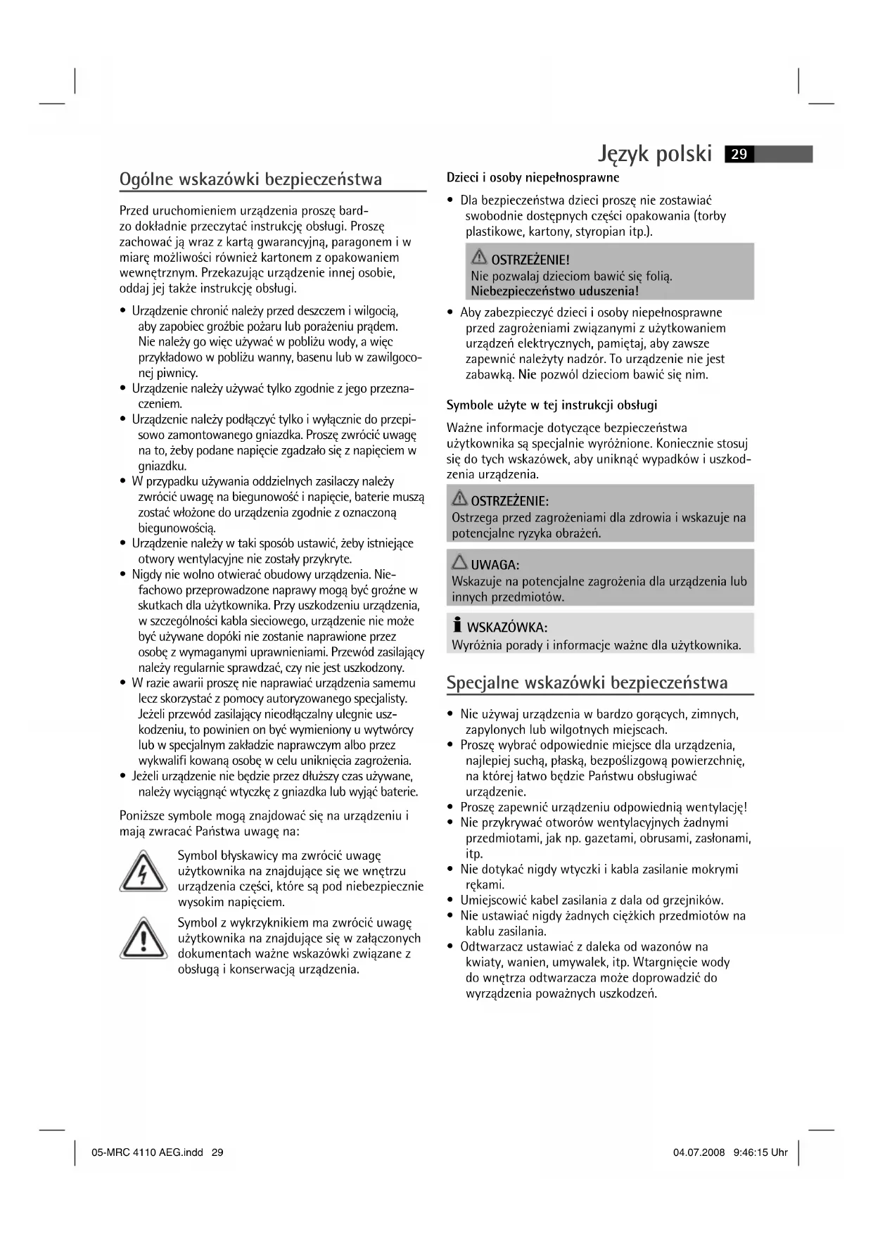 - Odtwarzacz ustawiać z daleka od wazonów na kwiaty, wanien, umywalek, itp. Wtargnięcie wody do wnętrza odtwarzacza może doprowadzić do wyrządzenia poważnych uszkodzeń. 05-MRC 4110 AEG.indd 2905-MRC 4110 AEG.indd 29 04.07.2008 9:46:15 Uhr04.07.2008 9:46:15 UhrJęzyk polski