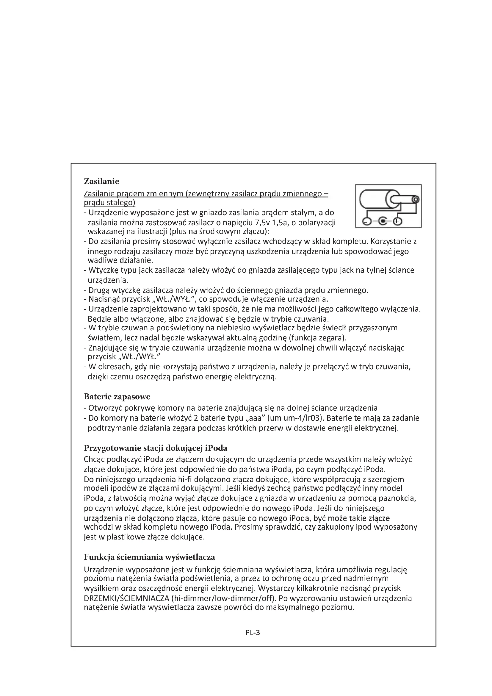 Zasilanie Zasilanie pr¹dem zmiennym (zewnêtrzny zasilacz pr¹du zmiennego – pr¹du sta³ego) - Urz¹dzenie wyposa¿one jest w gniazdo zasilania pr¹dem sta³ym, a do zasilania mo¿na zastosowaæ zasilacz o napiêciu 7,5v 1,5a, o polaryzacji wskazanej na ilustracji (plus na œrodkowym z³¹czu): - Do zasilania prosimy stosowaæ wy³¹cznie zasilacz wchodz¹cy w sk³ad kompletu. Korzystanie z innego rodzaju zasilaczy mo¿e byæ przyczyn¹ uszkodzenia urz¹dzenia lub spowodowaæ jego wadliwe dzia³anie. - Wtyczkê typu jack zasilacza nale¿y w³o¿yæ do gniazda zasilaj¹cego typu jack na tylnej œciance urz¹dzenia. - Drug¹ wtyczkê zasilacza nale¿y w³o¿yæ do œciennego gniazda pr¹du zmiennego. - Nacisn¹æ przycisk „W£./WY£.”, co spowoduje w³¹czenie urz¹dzenia. - Urz¹dzenie zaprojektowano w taki sposób, ¿e nie ma mo¿liwoœci jego ca³kowitego wy³¹czenia. Bêdzie albo w³¹czone, albo znajdowaæ siê bêdzie w trybie czuwania. - W trybie czuwania podœwietlony na niebiesko wyœwietlacz bêdzie œwieci³ przygaszonym œwiat³em, lecz nadal bêdzie wskazywa³ aktualn¹ godzinê (funkcja zegara). - Znajduj¹ce siê w trybie czuwania urz¹dzenie mo¿na w dowolnej chwili w³¹czyæ naciskaj¹c przycisk „W£./WY£.” - W okresach, gdy nie korzystaj¹ pañstwo z urz¹dzenia, nale¿y je prze³¹czyæ w tryb czuwania, dziêki czemu oszczêdz¹ pañstwo energiê elektryczn¹. Baterie zapasowe - Otworzyæ pokrywê komory na baterie znajduj¹c¹ siê na dolnej œciance urz¹dzenia. - Do komory na baterie w³o¿yæ 2 baterie typu „aaa” (um um-4/lr03). Baterie te maj¹ za zadanie podtrzymanie dzia³ania zegara podczas krótkich przerw w dostawie energii elektrycznej. Przygotowanie stacji dokuj¹cej iPoda Chc¹c pod³¹czyæ iPoda ze z³¹czem dokuj¹cym do urz¹dzenia przede wszystkim nale¿y w³o¿yæ z³¹cze dokuj¹ce, które jest odpowiednie do pañstwa iPoda, po czym pod³¹czyæ iPoda. Do niniejszego urz¹dzenia hi-fi do³¹czono z³¹cza dokuj¹ce, które wspó³pracuj¹ z szeregiem modeli ipodów ze z³¹czami dokuj¹cymi. Jeœli kiedyœ zechc¹ pañstwo pod³¹czyæ inny model iPoda, z ³atwoœci¹ mo¿na wyj¹æ z³¹cze dokuj¹ce z gniazda w urz¹dzeniu za pomoc¹ paznokcia, po czym w³o¿yæ z³¹cze, które jest odpowiednie do nowego iPoda. Jeœli do niniejszego urz¹dzenia nie do³¹czono z³¹cza, które pasuje do nowego iPoda, byæ mo¿e takie z³¹cze wchodzi w sk³ad kompletu nowego iPoda. Prosimy sprawdziæ, czy zakupiony ipod wyposa¿ony jest w plastikowe z³¹cze dokuj¹ce. Funkcja œciemniania wyœwietlacza Urz¹dzenie wyposa¿one jest w funkcjê œciemniana wyœwietlacza, która umo¿liwia regulacjê poziomu natê¿enia œwiat³a podœwietlenia, a przez to ochronê oczu przed nadmiernym wysi³kiem oraz oszczêdnoœæ energii elektrycznej. Wystarczy kilkakrotnie nacisn¹æ przycisk DRZEMKI/ŒCIEMNIACZA (hi-dimmer/low-dimmer/off). Po wyzerowaniu ustawieñ urz¹dzenia natê¿enie œwiat³a wyœwietlacza zawsze powróci do maksymalnego poziomu.PL-4 Dla innych modeli ipodów: Jeœli w komplecie nie ma z³¹cza dokuj¹cego odpowiedniego do Waszego IPoda, mo¿na skorzystaæ ze z³¹cza dokuj¹cego do³¹czonego do zakupionego IPoda. Funkcja zegara cyfrowego Urz¹dzenie wyposa¿one jest w zegar cyfrowy, który dzia³a, gdy urz¹dzenie pracuje w trybie czuwania (na wyœwietlaczu ci¹gle jest widoczna aktualna godzina). W takim trybie pracy wyœwietlacz podœwietlony jest przyciemnionym œwiat³em (co oszczêdza energiê elektryczn¹). Z³¹cza dokuj¹ce Nale¿y dobraæ z³¹cze dokuj¹ce, które wspó³pracuje z Pañstwa IPodem. Pañstwa IPod jest œciœle dopasowany do odpowiedniego z³¹cza.