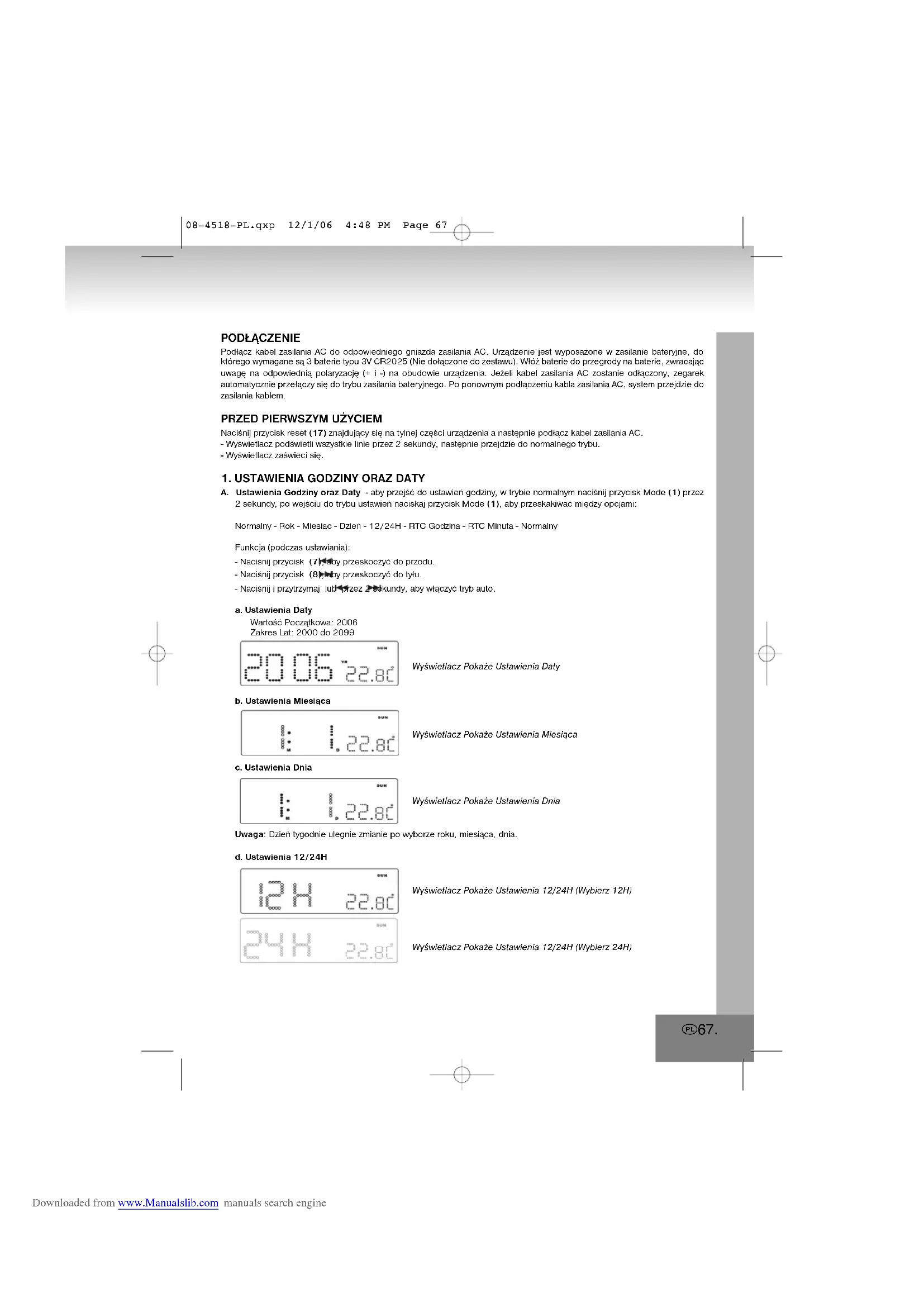 08-4518-PL.qxp 12/1/06 4:48 PM Page 67 Downloaded from www.Manualslib.com manuals search enginee. Ustawienia Godziny RTCWyświetlacz Pokaże Ustawienia Godzinyf. Ustawienia Minuty RTCWyświetlacz Pokaże Ustawienia MinutyUwaga: Sekundy zostaną skasowane po każdym ustawieniu minuty. B. Ustawienia Alarmu 1 i Alarmu 2 - aby przejść do trybu ustawień alarmu w trybie normalnym naciśnij przycisk Ustawienia Alarmu (2) przez 2 sekundy, po wejściu do trybu ustawień naciskaj przycisk Ustawienia Alarmu (2), aby przeskakiwać między opcjami:Normalny - AL1 Godzina - AL1 Minuta - AL1 Weekend Alarm - AL2 Godzina - AL2 Minuta - AL2 Weekend - Alarm - NormalnyFunkcja (podczas ustawiania):- Naciśnij przycisk (7), aby przeskoczyć do przodu.- Naciśnij przycisk (8), aby przeskoczyć do tyłu.- Naciśnij i przytrzymaj lub przez 2 sekundy, aby włączyć tryb auto.Wyświetlacz Pokaże Ustawienia Alarmu 1 GodzinaWyświetlacz Pokaże Ustawienia Alarmu 1 MinutaWyświetlacz Pokaże Ustawienia Alarmu 1 Weekend Alarm – Pon do PiąWyświetlacz Pokaże Ustawienia Alarmu 1 Weekend Alarm – Pon do NieWyświetlacz Pokaże Ustawienia Alarmu 1 Weekend Alarm – Pon do SobWyświetlacz Pokaże Ustawienia Alarmu 2 GodzinaWyświetlacz Pokaże Ustawienia Alarmu 2 MinutaWyświetlacz Pokaże Ustawienia Alarmu 2 Weekend Alarm – Pon do Pią