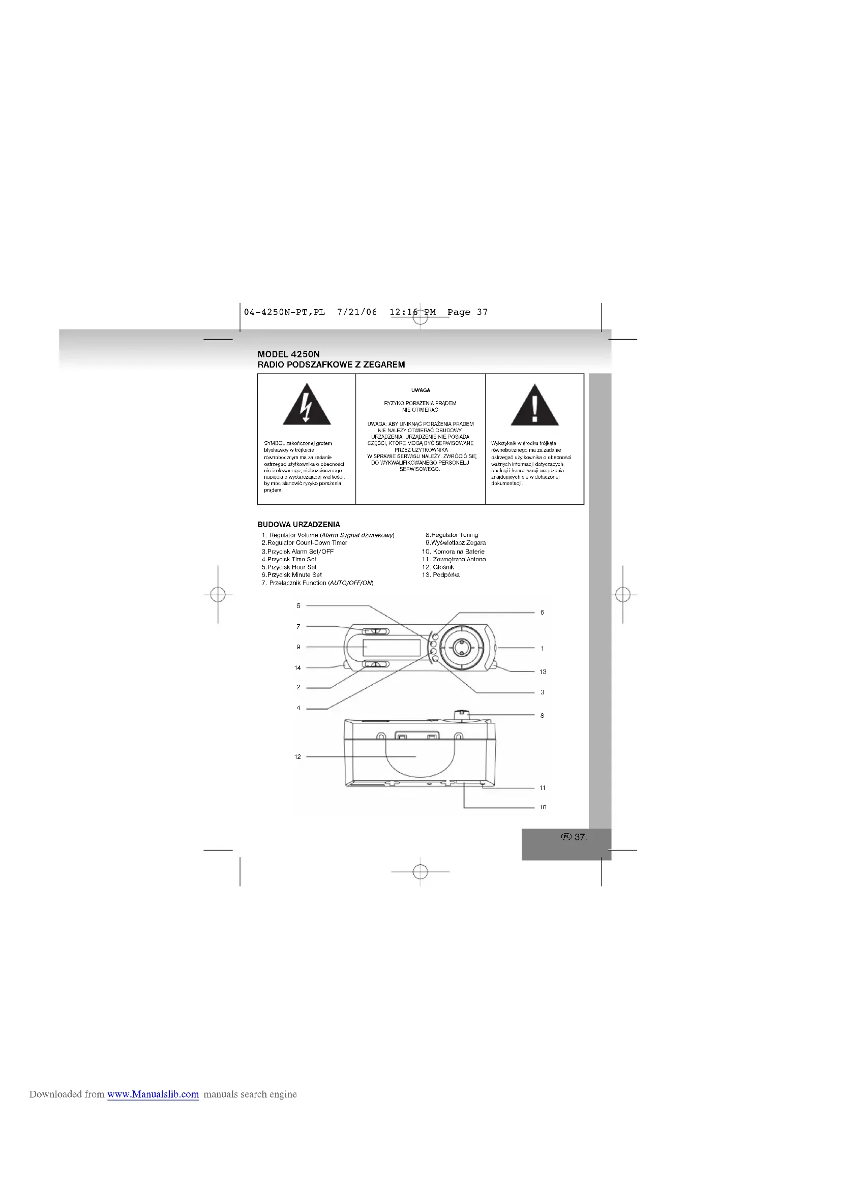 04-4250N-PT,PL 7/21/06 12:16 PM Page 37 Downloaded from www.Manualslib.com manuals search engineŹRÓDŁA ZASILANIA Włóż 1 baterię 9V typu 006P do komory na baterie (10). Będzie ona służyć jako podtrzymanie ustawień zegara. Przed podłączeniem kabla zasilającego sprawdź oznaczenia dotyczące napięcia i natężenia urządzenia. MUSZĄ one ZGADZAĆ się z napięciem i natężeniem danego gniazdka. Następnie podłącz kabel go gniazdka zasilania. INFORMACJA: Zawsze wyjmuj baterie z komory na baterie, jeśli urządzenie nie będzie używane przez długi okres czasu. Dzięki temu unikniesz wycieku baterii, który uszkodziłby urządzenie. W celu osiągnięcianajlepszego funkcjonowanie zalecamy korzystanie z baterii alkalicznych.LOKALIZACJAUrządzenie jest przeznaczone do instalacji pod wiszącą szafką kuchenną, lub do stawiania na biurku za pomocą podpórek. W celu montażu urządzenia pod szafką kuchenną przeczytaj część zatytułowaną —INSTALACJA—. USTAWIANIE ZEGARA