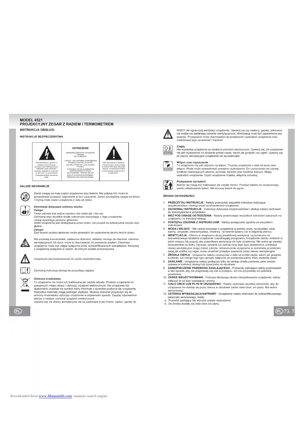 Wyłącz urządzenie, naciskając przycisk ON / OFF (17). Ustaw odległość ogniskową za pomocą koła regulacji FOCUS (24). Projektor można obrócić o 90º, a następnie skierować bezpośrednio na sufit lub ścianę. Uwagi: Rzutowany czas można zobaczyć tylko w przyciemnionym pokoju. Zasięg wynosi od 1 do 3 metrów. Przycisk resetowania Przycisk RESET znajduje się na spodzie urządzenia i wymaga naciśnięcia po wymianie baterii lub wystąpieniu usterki. Za pomocą tego przycisku można usunąć wszystkie ustawienia i przywrócić ustawienia domyślne. SPECYFIKACJE TECHNICZNE Zakres częstotliwości : MW (AM) 525 kHz - 1615 kHz UKW (FM) 87,5 MHz - 108 MHz Impedancja głośnika : 8 Ω Baterie : 3 x 3 V baterie litowe CR 2025 (niedołączone) Zasilanie : AC 230 V~ 50 Hz Pobór mocy : 5 W Waga : ok. 0,7 kg Wymiary : ok. 101 x 101 x 153 mm SPECYFIKACJE PODLEGAJĄ ZMIANIE BEZ UPRZEDNIEGO POWIADOMIENIA. Downloaded from www.Manualslib.com manuals search engine83. 82. Het driehoekige symbool met bliksemschicht wijst de gebruiker erop dat binnenin deze eenheid een gevaarlijke niet geïsoleerde spanning aanwezig is die tot een elektrische schok kan leiden.Het driehoekige symbool met uitroepteken wijst de gebruiker erop dat er belangrijke instructies betreffende het gebruik en het onderhoud opgenomen zijn in de handleiding bij deze eenheid.OPGELETRISICO OP EEN GEVAARLIJKE SCHOKNIET OPENEN OPGELET: OM HET RISICO OP EEN ELEKTRISCHE SCHOK TE VERMIJDEN, DE VOOR- OF ACHTERKANT NIET VERWIJDEREN. BINNENIN BEVINDEN ZICH GEEN DELEN DIE DOOR DE GEBRUIKER ONDERHOUDEN KUNNEN WORDEN. DOE EEN BEROEP OP EEN ERKENDE EN BEVOEGDE TECHNISCHE DIENST MODEL 4521