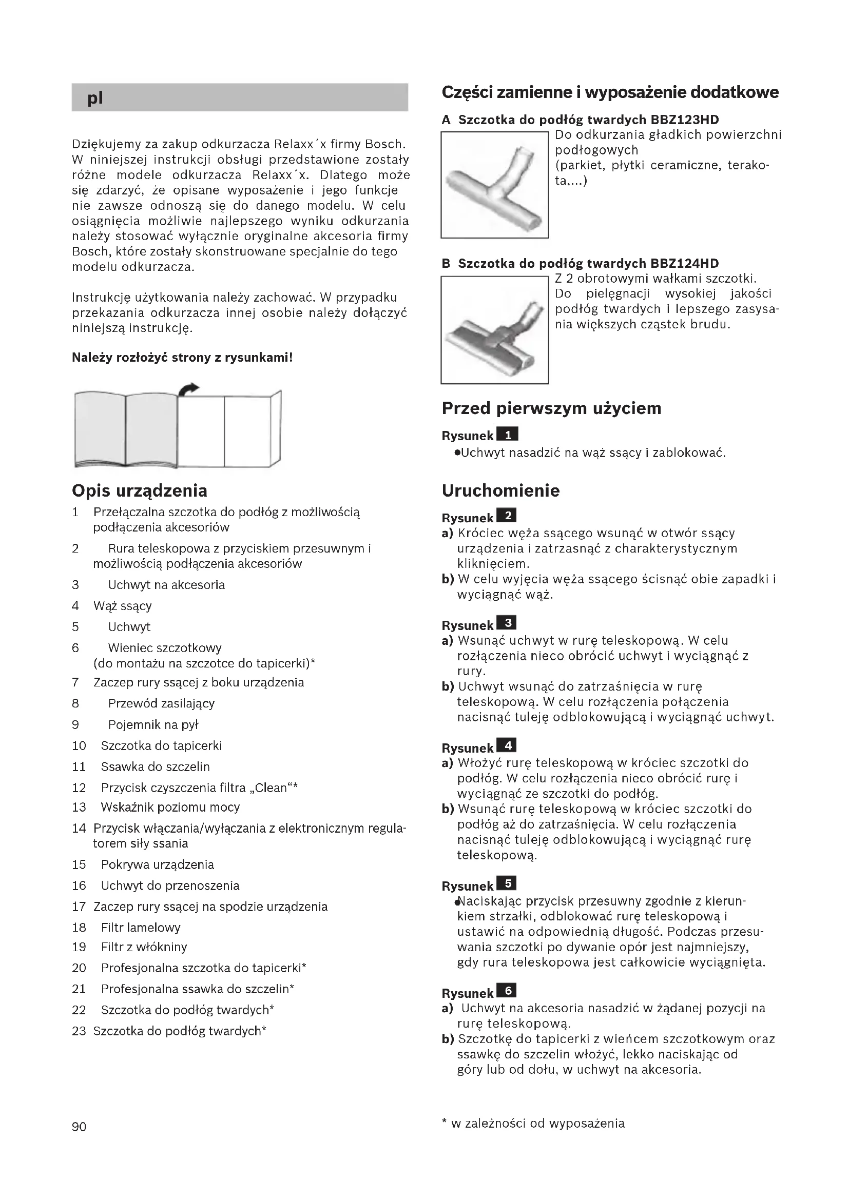 Dziękujemy za zakup odkurzacza Relaxx´x firmy Bosch. W niniejszej instrukcji obsługi przedstawione zostały różne modele odkurzacza Relaxx´x. Dlatego może się zdarzyć, że opisane wyposażenie i jego funkcje nie zawsze odnoszą się do danego modelu. W celu osiągnięcia możliwie najlepszego wyniku odkurzania należy stosować wyłącznie oryginalne akcesoria firmy Bosch, które zostały skonstruowane specjalnie do tego modelu odkurzacza. Instrukcję użytkowania należy zachować. W przypadku przekazania odkurzacza innej osobie należy dołączyć niniejszą instrukcję. Należy rozłożyć strony z rysunkami! Opis urządzenia 1 Przełączalna szczotka do podłóg z możliwością podłączenia akcesoriów 2 Rura teleskopowa z przyciskiem przesuwnym i możliwością podłączenia akcesoriów 3 Uchwyt na akcesoria 4 Wąż ssący 5 Uchwyt 6 Wieniec szczotkowy (do montażu na szczotce do tapicerki)* 7 Zaczep rury ssącej z boku urządzenia 8 Przewód zasilający 9 Pojemnik na pył 10 Szczotka do tapicerki 11 Ssawka do szczelin 12 Przycisk czyszczenia filtra „Clean“* 13 Wskaźnik poziomu mocy 14 Przycisk włączania/wyłączania z elektronicznym regula- torem siły ssania 15 Pokrywa urządzenia 16 Uchwyt do przenoszenia 17 Zaczep rury ssącej na spodzie urządzenia 18 Filtr lamelowy 19 Filtr z włókniny 20 Profesjonalna szczotka do tapicerki* 21 Profesjonalna ssawka do szczelin* 22 Szczotka do podłóg twardych* 23 Szczotka do podłóg twardych*