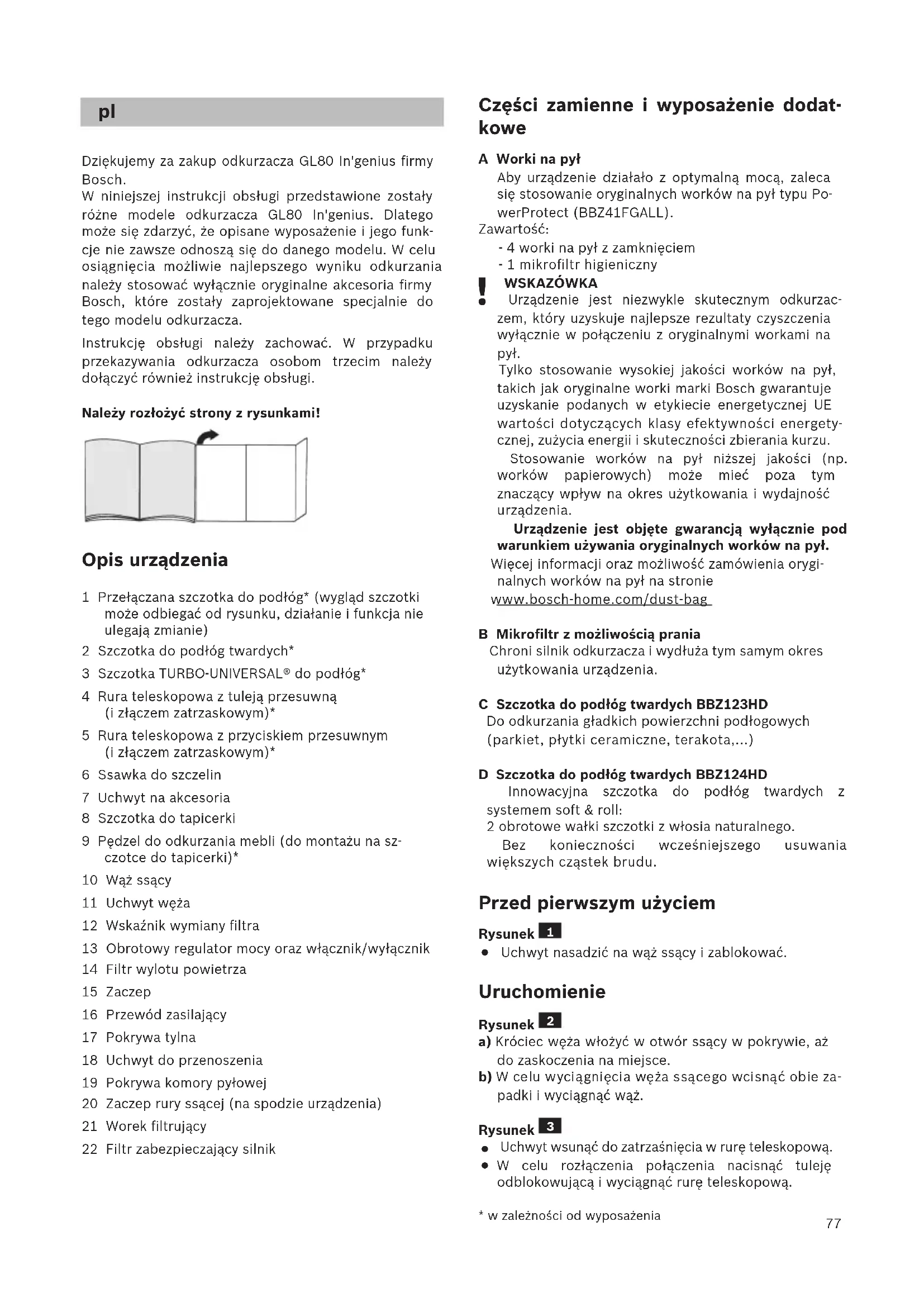 Aşındırıcı temizleme maddesi, cam temizleyici veya çok amaçlı temizleyiciler kullanılmamalıdır. Elektrikli süpürge kesinlikle suya sokulmamalıdır. Toz bölmesi gerekirse ikinci bir elektrik süpürgesi kullanılarak süpürülebilir veya sadece kuru bir toz bezi / toz fırçası ile temizlenebilir. Üretici firma, ürünün teknik özelliklerinde değişiklik yapma hakkına sahiptir.77 Dziękujemy za zakup odkurzacza GL80 In'genius firmy Bosch. W niniejszej instrukcji obsługi przedstawione zostały różne modele odkurzacza GL80 In'genius. Dlatego może się zdarzyć, że opisane wyposażenie i jego funk- cje nie zawsze odnoszą się do danego modelu. W celu osiągnięcia możliwie najlepszego wyniku odkurzania należy stosować wyłącznie oryginalne akcesoria firmy Bosch, które zostały zaprojektowane specjalnie do tego modelu odkurzacza. Instrukcję obsługi należy zachować. W przypadku przekazywania odkurzacza osobom trzecim należy dołączyć również instrukcję obsługi. Należy rozłożyć strony z rysunkami! Opis urządzenia 1 Przełączana szczotka do podłóg* (wygląd szczotki może odbiegać od rysunku, działanie i funkcja nie ulegają zmianie) 2 Szczotka do podłóg twardych* 3 Szczotka TURBO-UNIVERSAL® do podłóg* 4 Rura teleskopowa z tuleją przesuwną (i złączem zatrzaskowym)* 5 Rura teleskopowa z przyciskiem przesuwnym (i złączem zatrzaskowym)* 6 Ssawka do szczelin 7 Uchwyt na akcesoria 8 Szczotka do tapicerki 9 Pędzel do odkurzania mebli (do montażu na sz- czotce do tapicerki)* 10 Wąż ssący 11 Uchwyt węża 12 Wskaźnik wymiany filtra 13 Obrotowy regulator mocy oraz włącznik/wyłącznik 14 Filtr wylotu powietrza 15 Zaczep 16 Przewód zasilający 17 Pokrywa tylna 18 Uchwyt do przenoszenia 19 Pokrywa komory pyłowej 20 Zaczep rury ssącej (na spodzie urządzenia) 21 Worek filtrujący 22 Filtr zabezpieczający silnik