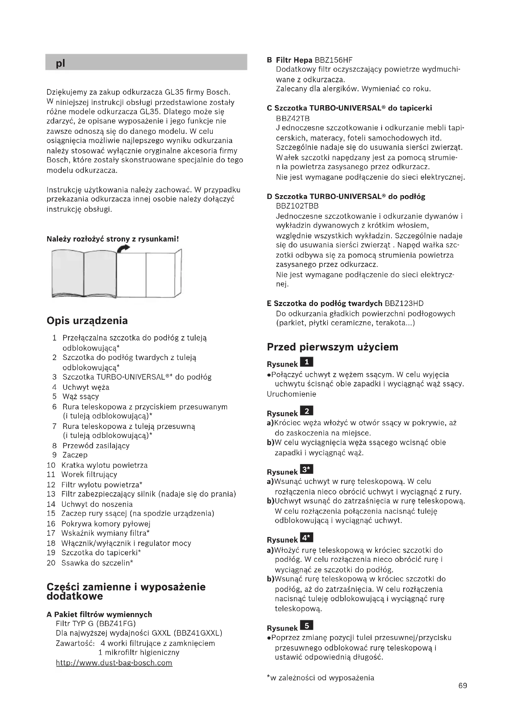 nstrukcję użytkowania należy zachować. W przypadku przekazania odkurzacza innej osobie należy dołączyć instrukcję obsługi. Należy rozłożyć strony z rysunkami! Opis urządzenia 1 Przełączalna szczotka do podłóg z tuleją odblokowującą* 2 Szczotka do podłóg twardych z tuleją odblokowującą* 3 Szczotka TURBO-UNIVERSAL®* do podłóg 4 Uchwyt węża 5 Wąż ssący 6 Rura teleskopowa z przyciskiem przesuwanym (i tuleją odblokowującą)* 7 Rura teleskopowa z tuleją przesuwną (i tuleją odblokowującą)* 8 Przewód zasilający 9 Zaczep 10 Kratka wylotu powietrza 11 Worek filtrujący 12 Filtr wylotu powietrza* 13 Filtr zabezpieczający silnik (nadaje się do prania) 14 Uchwyt do noszenia 15 Zaczep rury ssącej (na spodzie urządzenia) 16 Pokrywa komory pyłowej 17 Wskaźnik wymiany filtra* 18 Włącznik/wyłącznik i regulator mocy 19 Szczotka do tapicerki* 20 Ssawka do szczelin* Części zamienne i wyposażenie dodatkowe A Pakiet filtrów wymiennych Filtr TYP G (BBZ41FG) Dla najwyższej wydajności GXXL (BBZ41GXXL) Zawartość: 4 worki filtrujące z zamknięciem 1 mikrofiltr higieniczny http://www.dust-bag-bosch.com