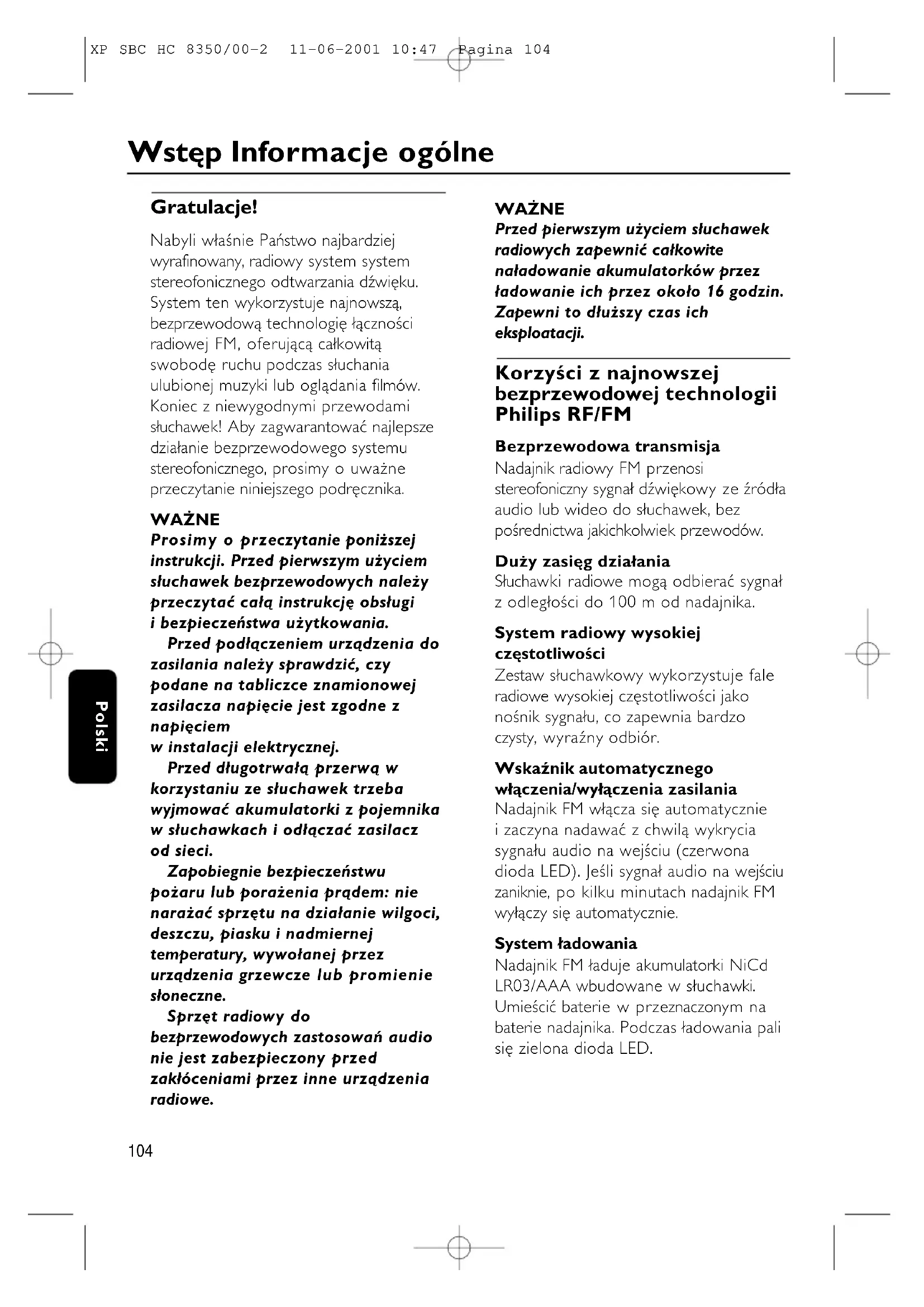 Gratulacje! Nabyli właśnie Państwo najbardziej wyrafinowany, radiowy system system stereofonicznego odtwarzania dźwięku. System ten wykorzystuje najnowszą, bezprzewodową technologię łączności radiowej FM, oferującą całkowitą swobodę ruchu podczas słuchania ulubionej muzyki lub oglądania filmów. Koniec z niewygodnymi przewodami słuchawek! Aby zagwarantować najlepsze działanie bezprzewodowego systemu stereofonicznego, prosimy o uważne przeczytanie niniejszego podręcznika. WAŻNE Prosimy o przeczytanie poniższej instrukcji. Przed pierwszym użyciem słuchawek bezprzewodowych należy przeczytać całą instrukcję obsługi i bezpieczeństwa użytkowania. Przed podłączeniem urządzenia do zasilania należy sprawdzić, czy podane na tabliczce znamionowej zasilacza napięcie jest zgodne z napięciem w instalacji elektrycznej. Przed długotrwałą przerwą w korzystaniu ze słuchawek trzeba wyjmować akumulatorki z pojemnika w słuchawkach i odłączać zasilacz od sieci. Zapobiegnie bezpieczeństwu pożaru lub porażenia prądem: nie narażać sprzętu na działanie wilgoci, deszczu, piasku i nadmiernej temperatury, wywołanej przez urządzenia grzewcze lub promienie słoneczne. Sprzęt radiowy do bezprzewodowych zastosowań audio nie jest zabezpieczony przed zakłóceniami przez inne urządzenia radiowe. WAŻNE Przed pierwszym użyciem słuchawek radiowych zapewnić całkowite naładowanie akumulatorków przez ładowanie ich przez około 16 godzin. Zapewni to dłuższy czas ich eksploatacji. Korzyści z najnowszej bezprzewodowej technologii Philips RF/FM Bezprzewodowa transmisja Nadajnik radiowy FM przenosi stereofoniczny sygnał dźwiękowy ze źródła audio lub wideo do słuchawek, bez pośrednictwa jakichkolwiek przewodów. Duży zasięg działania Słuchawki radiowe mogą odbierać sygnał z odległości do 100 m od nadajnika. System radiowy wysokiej częstotliwości Zestaw słuchawkowy wykorzystuje fale radiowe wysokiej częstotliwości jako nośnik sygnału, co zapewnia bardzo czysty, wyraźny odbiór. Wskaźnik automatycznego włączenia/wyłączenia zasilania Nadajnik FM włącza się automatycznie i zaczyna nadawać z chwilą wykrycia sygnału audio na wejściu (czerwona dioda LED). Jeśli sygnał audio na wejściu zaniknie, po kilku minutach nadajnik FM wyłączy się automatycznie. System ładowania Nadajnik FM ładuje akumulatorki NiCd LR03/AAA wbudowane w słuchawki. Umieścić baterie w przeznaczonym na baterie nadajnika. Podczas ładowania pali się zielona dioda LED. Wstęp Informacje ogólne XP SBC HC 8350/00-2 11-06-2001 10:47 Pagina 104Polski