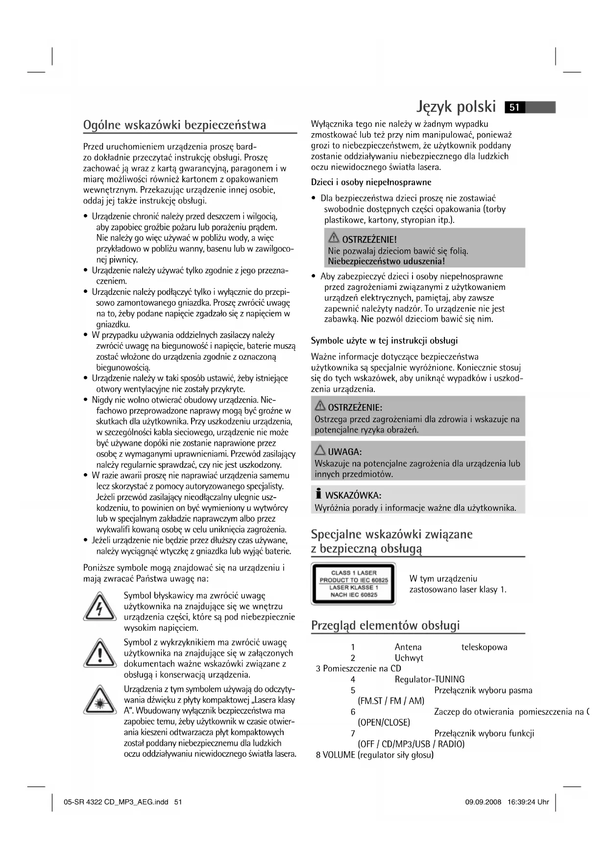 - Aby zabezpieczyć dzieci i osoby niepełnosprawne przed zagrożeniami związanymi z użytkowaniem urządzeń elektrycznych, pamiętaj, aby zawsze zapewnić należyty nadzór. To urządzenie nie jest zabawką. Nie pozwól dzieciom bawić się nim. Symbole użyte w tej instrukcji obsługi Ważne informacje dotyczące bezpieczeństwa użytkownika są specjalnie wyróżnione. Koniecznie stosuj się do tych wskazówek, aby uniknąć wypadków i uszkod- zenia urządzenia. OSTRZEŻENIE: Ostrzega przed zagrożeniami dla zdrowia i wskazuje na potencjalne ryzyka obrażeń. UWAGA: Wskazuje na potencjalne zagrożenia dla urządzenia lub innych przedmiotów. WSKAZÓWKA: Wyróżnia porady i informacje ważne dla użytkownika. Specjalne wskazówki związane z bezpieczną obsługą W tym urządzeniu zastosowano laser klasy 1. Przegląd elementów obsługi 1 Antena teleskopowa 2 Uchwyt 3 Pomieszczenie na CD 4 Regulator-TUNING 5 Przełącznik wyboru pasma (FM.ST / FM / AM) 6 Zaczep do otwierania pomieszczenia na CD (OPEN/CLOSE) 7 Przełącznik wyboru funkcji (OFF / CD/MP3/USB / RADIO) 8 VOLUME (regulator siły głosu) 05-SR 4322 CD_MP3_AEG.indd 5105-SR 4322 CD_MP3_AEG.indd 51 09.09.2008 16:39:24 Uhr09.09.2008 16:39:24 UhrJęzyk polski