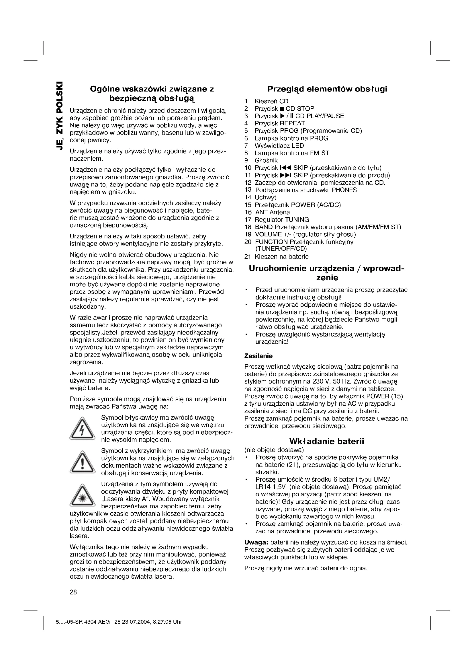 Podłączenie na słuchawki PHONES 14 Uchwyt 15 Przełącznik POWER (AC/DC) 16 ANT Antena 17 Regulator TUNING 18 BAND Przełącznik wyboru pasma (AM/FM/FM ST) 19 VOLUME +/- (regulator siły głosu) 20 FUNCTION Przełącznik funkcyjny (TUNER/OFF/CD) 21 Kieszeń na baterie Uruchomienie urządzenia / wprowad- zenie