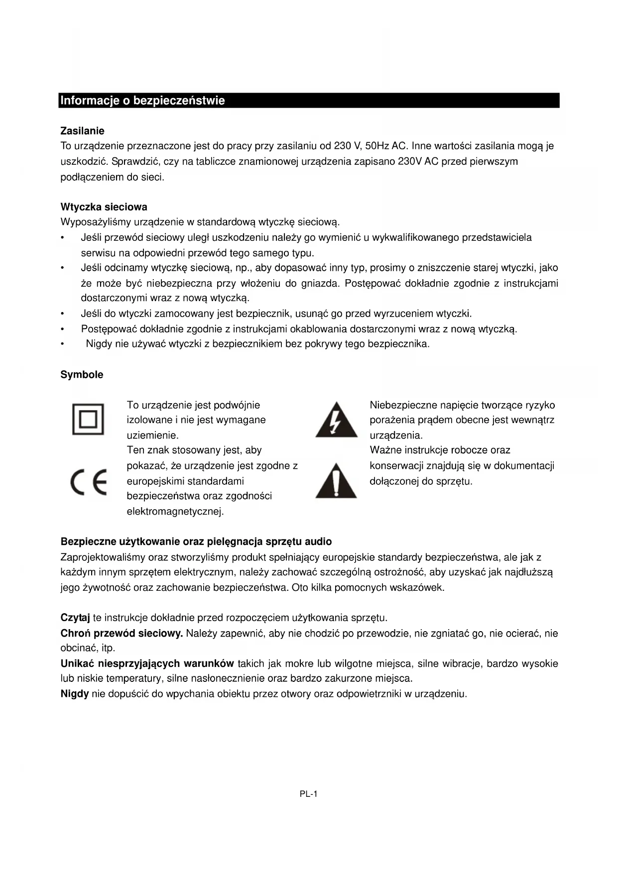 Ważne instrukcje robocze oraz konserwacji znajdują się w dokumentacji dołączonej do sprzętu. Bezpieczne użytkowanie oraz pielęgnacja sprzętu audio Zaprojektowaliśmy oraz stworzyliśmy produkt spełniający europejskie standardy bezpieczeństwa, ale jak z każdym innym sprzętem elektrycznym, należy zachować szczególną ostrożność, aby uzyskać jak najdłuższą jego żywotność oraz zachowanie bezpieczeństwa. Oto kilka pomocnych wskazówek. Czytaj te instrukcje dokładnie przed rozpoczęciem użytkowania sprzętu. Chroń przewód sieciowy. Należy zapewnić, aby nie chodzić po przewodzie, nie zgniatać go, nie ocierać, nie obcinać, itp. Unikać niesprzyjających warunków takich jak mokre lub wilgotne miejsca, silne wibracje, bardzo wysokie lub niskie temperatury, silne nasłonecznienie oraz bardzo zakurzone miejsca. Nigdy nie dopuścić do wpychania obiektu przez otwory oraz odpowietrzniki w urządzeniu.PL-2 Informacje o bezpieczeństwie Aby zaoszczędzić moc, należy odłączyć od zasilania lub wyjąć wtyczkę z gniazda, kiedy nie używamy urządzenia, chyba, że funkcja urządzenia wymaga ciągłego zasilania. Nie używać sprzętu w wypadku, gdy wylano na niego płyny. Jeśli jest uszkodzony w jakikolwiek sposób lub jeśli nie pracuje normalnie. Natychmiast odłączyć od gniazda i zasięgnąć porady specjalisty. Wyjąć wtyczkę sieciową z gniazda w razie burzy. Urządzenie przeznaczone wyłącznie do użytku domowego. Jakiekolwiek inne użytkowanie prowadzi do unieważnienia gwarancji i może być niebezpieczne. Wentylacja Umieścić urządzenie na twardej, płaskiej powierzchni z dala od bezpośredniego nasłonecznienia oraz źródeł gorąca. Jeśli znajduje się w szafce, pozostawić przestrzeń co najmniej 10cm naokoło. Nie zatykać otworów wentylacyjnych, w tym tych na spodzie z miękkim wyposażeniem. Przegrzanie skraca żywotność sprzętu i zwiększa ryzyko pożaru. Czyszczenie Odłączyć zasilanie i używać wyłącznie delikatnie nawilżonej miękkiej szmatki. Nie używać chemicznych rozpuszczalników ani silnych detergentów, jako że mogą uszkodzić kosmetyczne wykończenie. Baterie Wyjąć baterie, kiedy urządzenie nie jest używane przez dłuższy czas. Baterie pozostałe w urządzeniu mogą powodować uszkodzenia poprzez niszczenie oraz korozyjne przecieki, unieważniając gwarancję. Aby chronić środowisko prosimy korzystać z lokalnych placówek w celu usuwania baterii. Utylizacja Odpady elektryczne oraz elektroniczne absolutnie nie mogą być usuwane wraz z odpadami gospodarstwa domowego. Prosimy skontaktować się ze sprzedawcą, u którego zakupiliśmy urządzenie w celu uzyskania instrukcji dotyczącej wyrzucenia. Baterie oraz materiały opakowania można poddać recyklingowi w lokalnych punktach zbiórki. Ważne ostrzeżenia dotyczące bezpieczeństwa Aby zapobiec porażeniu prądem, nie zdejmować obudowy. Jeśli coś wydaje się nieprawidłowe, nie próbować naprawiać tego samodzielnie, należy sprawdzić to u wykwalifikowanego przedstawiciela serwisu. Nie narażać urządzenia na przecieki ani rozpryski wody ani nie ustawiać pojemników z wodą, takich jak wazony na urządzeniu. Nigdy nie ustawiać źródeł ognia na lub w pobliżu urządzenia. Małe elementy. Nie pozwalać, aby dzieci bawiły się urządzeniem. Nigdy nie obsługiwać urządzenia ani nie oglądać wideo podczas prowadzenia samochodu.