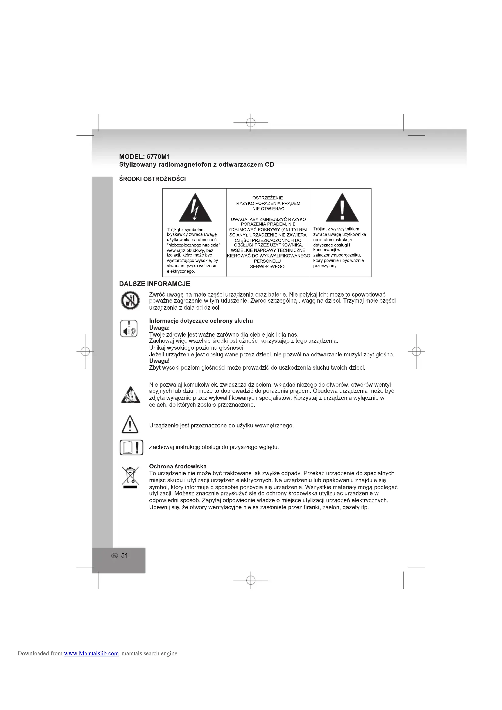 GERAIS Fonte de alimentação: 230V CA ~ 50Hz 6 x pilhas C (UM-2/R-14) 9V CC (não incluídas)Dimensões: 210 (C) x 145 (L) x 290 (A) mmPeso: 1,9 kgFrequência de banda: AM (MW) 525 - 1615kHz FM (UKW) 87.5 - 108MHzÁUDIOImpedância da coluna: 8 Ohm(As especificações estão sujeitas a alterações sem aviso prévio.) Downloaded from www.Manualslib.com manuals search engine51. Zwróć uwagę na małe części urządzenia oraz baterie. Nie połykaj ich; może to spowodować poważne zagrożenie w tym uduszenie. Zwróć szczególną uwagę na dzieci. Trzymaj małe części urządzenia z dala od dzieci.Informacje dotyczące ochrony słuchuUwaga:Twoje zdrowie jest ważne zarówno dla ciebie jak i dla nas.Zachowaj więc wszelkie środki ostrożności korzystając z tego urządzenia.Unikaj wysokiego poziomu głośności.Jeżeli urządzenie jest obsługiwane przez dzieci, nie pozwól na odtwarzanie muzyki zbyt głośno.Uwaga!Zbyt wysoki poziom głośności może prowadzić do uszkodzenia słuchu twoich dzieci.Nie pozwalaj komukolwiek, zwłaszcza dzieciom, wkładać niczego do otworów, otworów wentyl acyjnych lub dziur; może to doprowadzić do porażenia prądem. Obudowa urządzenia może być zdjęta wyłącznie przez wykwalifikowanych specjalistów. Korzystaj z urządzenia wyłącznie w celach, do których zostało przeznaczone.Urządzenie jest przeznaczone do użytku wewnętrznego.Zachowaj instrukcję obsługi do przyszłego wglądu.Ochrona środowiskaTo urządzenie nie może być traktowane jak zwykłe odpady. Przekaż urządzenie do specjalnych miejsc skupu i utylizacji urządzeń elektrycznych. Na urządzeniu lub opakowaniu znajduje się symbol, który informuje o sposobie pozbycia się urządzenia. Wszystkie materiały mogą podlegać utylizacji. Możesz znacznie przysłużyć się do ochrony środowiska utylizując urządzenie w odpowiedni sposób. Zapytaj odpowiednie władze o miejsce utylizacji urządzeń elektrycznych.Upewnij się, że otwory wentylacyjne nie są zasłonięte przez firanki, zasłon, gazety itp. DALSZE INFORAMCJE MODEL: 6770M1 Stylizowany radiomagnetofon z odtwarzaczem CD ŚRODKI OSTROŻNOŚCIOSTRZEŻENIERYZYKO PORAŻENIA PRĄDEMNIE OTWIERAĆUWAGA: ABY ZMNIEJSZYĆ RYZYKOPORAŻENIA PRĄDEM, NIEZDEJMOWAĆ POKRYWY (ANI TYLNEJŚCIANY). URZĄDZENIE NIE ZAWIERACZĘŚCI PRZEZNACZONYCH DOOBSŁUGI PRZEZ UŻYTKOWNIKA.WSZELKIE NAPRAWY TECHNICZNEKIEROWAĆ DO WYKWALIFIKOWANEGOPERSONELUSERWISOWEGO.Trójkąt z wykrzyknikiem zwraca uwagę użytkownika na istotne instrukcje dotyczące obsługi i konserwacji w załączonympodręczniku, który powinien być ważnieprzeczytany.Trójkąt z symbolem błyskawicy zwraca uwagę użytkownika na obecność "niebezpiecznego napięcia" wewnątrz obudowy, bez izolacji, które może być wystarczająco wysokie, bystwarzać ryzyko wstrząsuelektrycznego. Downloaded from www.Manualslib.com manuals search engine52. ZASILANE Włóż 6 baterii typu “C“ doprzegrody na baterię.