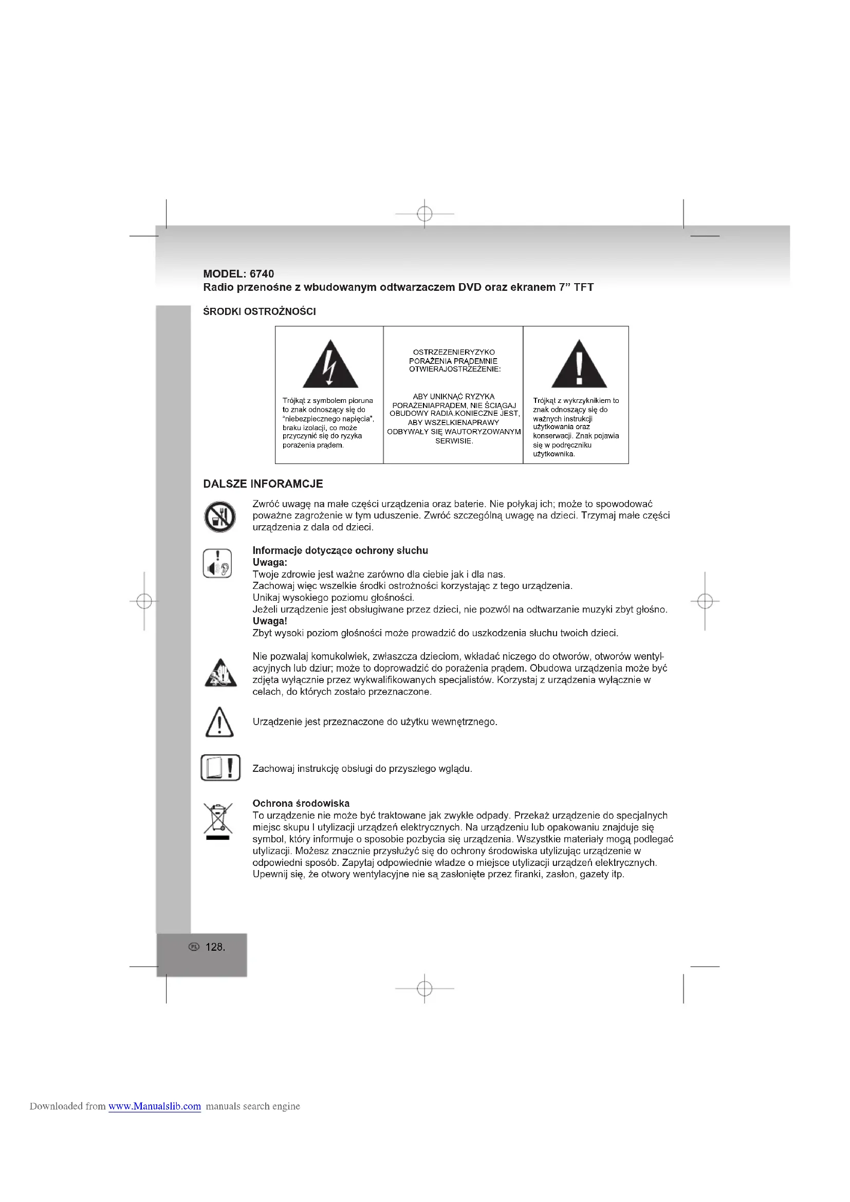 Downloaded from www.Manualslib.com manuals search engine128. MODEL: 6740 Radio przenośne z wbudowanym odtwarzaczem DVD oraz ekranem 7” TFT ŚRODKI OSTROŻNOŚCIOSTRZEZENIERYZYKO PORAŻENIA PRĄDEMNIE OTWIERAJOSTRZEŻENIE:ABY UNIKNĄĆ RYZYKA PORAŻENIAPRĄDEM, NIE ŚCIĄGAJ OBUDOWY RADIA.KONIECZNE JEST, ABY WSZELKIENAPRAWY ODBYWAŁY SIĘ WAUTORYZOWANYM SERWISIE.Trójkąt z wykrzyknikiem to znak odnoszący się do ważnych instrukcji użytkowania oraz konserwacji. Znak pojawia się w podręczniku użytkownika.Trójkąt z symbolem pioruna to znak odnoszący się do “niebezpiecznego napięcia”, braku izolacji, co może przyczynić się do ryzyka porażenia prądem.Zwróć uwagę na małe części urządzenia oraz baterie. Nie połykaj ich; może to spowodować poważne zagrożenie w tym uduszenie. Zwróć szczególną uwagę na dzieci. Trzymaj małe części urządzenia z dala od dzieci.Informacje dotyczące ochrony słuchuUwaga:Twoje zdrowie jest ważne zarówno dla ciebie jak i dla nas.Zachowaj więc wszelkie środki ostrożności korzystając z tego urządzenia.Unikaj wysokiego poziomu głośności.Jeżeli urządzenie jest obsługiwane przez dzieci, nie pozwól na odtwarzanie muzyki zbyt głośno.Uwaga!Zbyt wysoki poziom głośności może prowadzić do uszkodzenia słuchu twoich dzieci.Nie pozwalaj komukolwiek, zwłaszcza dzieciom, wkładać niczego do otworów, otworów wentyl acyjnych lub dziur; może to doprowadzić do porażenia prądem. Obudowa urządzenia może być zdjęta wyłącznie przez wykwalifikowanych specjalistów. Korzystaj z urządzenia wyłącznie w celach, do których zostało przeznaczone.Urządzenie jest przeznaczone do użytku wewnętrznego.Zachowaj instrukcję obsługi do przyszłego wglądu.Ochrona środowiskaTo urządzenie nie może być traktowane jak zwykłe odpady. Przekaż urządzenie do specjalnych miejsc skupu I utylizacji urządzeń elektrycznych. Na urządzeniu lub opakowaniu znajduje się symbol, który informuje o sposobie pozbycia się urządzenia. Wszystkie materiały mogą podlegać utylizacji. Możesz znacznie przysłużyć się do ochrony środowiska utylizując urządzenie w odpowiedni sposób. Zapytaj odpowiednie władze o miejsce utylizacji urządzeń elektrycznych.Upewnij się, że otwory wentylacyjne nie są zasłonięte przez firanki, zasłon, gazety itp. DALSZE INFORAMCJE Downloaded from www.Manualslib.com manuals search engine129. Otwory wentylacyjne zawsze muszą być odsłonięte. Przegrzanie urządzenia może powodować uszkodzenie lub skrócić jego żywotność. Ciepło Nie wystawiaj urządzenia na działanie promieni słonecznych. Upewnij się, że urządzenie nie jest wystawione na działanie ęródeł ciepła, takich jak grzejniki czy ogień. Upewnij się, że otwory wentylacyjne urządzenia nie są zasłonięte. Wilgoć oraz czyszczenie To urządzenie nie jest odporne na wilgoć. Trzymaj urządzenie z dala od wody oraz wilgoci. Woda może spowodować poważne uszkodzenia. Do czyszczenia nie używaj środków zawierających alkohol, amoniak, benzen oraz środków żrących. Mogą uszkodzić urządzenie. Czyść urządzenie miękką, wilgotną szmatką. Pozbywanie się baterii Baterie nie mogą być traktowane jak zwykłe śmieci. Przekaż baterie do oznaczonego punktu składowania baterii. Nie wrzucaj baterii do ognia. ŚRODKI OSTROŻNOŚCI1. PRZECZYTAJ INSTRUKCJE - Należy przeczytać wszystkie instrukcje dotyczące bezpieczeństwa i obsługi przed uruchomieniem urządzenia.2. ZACHOWAJ INSTRUKCJE - Instrukcje dotyczące bezpieczeństwa i obsługi należy zachować do wykorzystania w przyszłości.