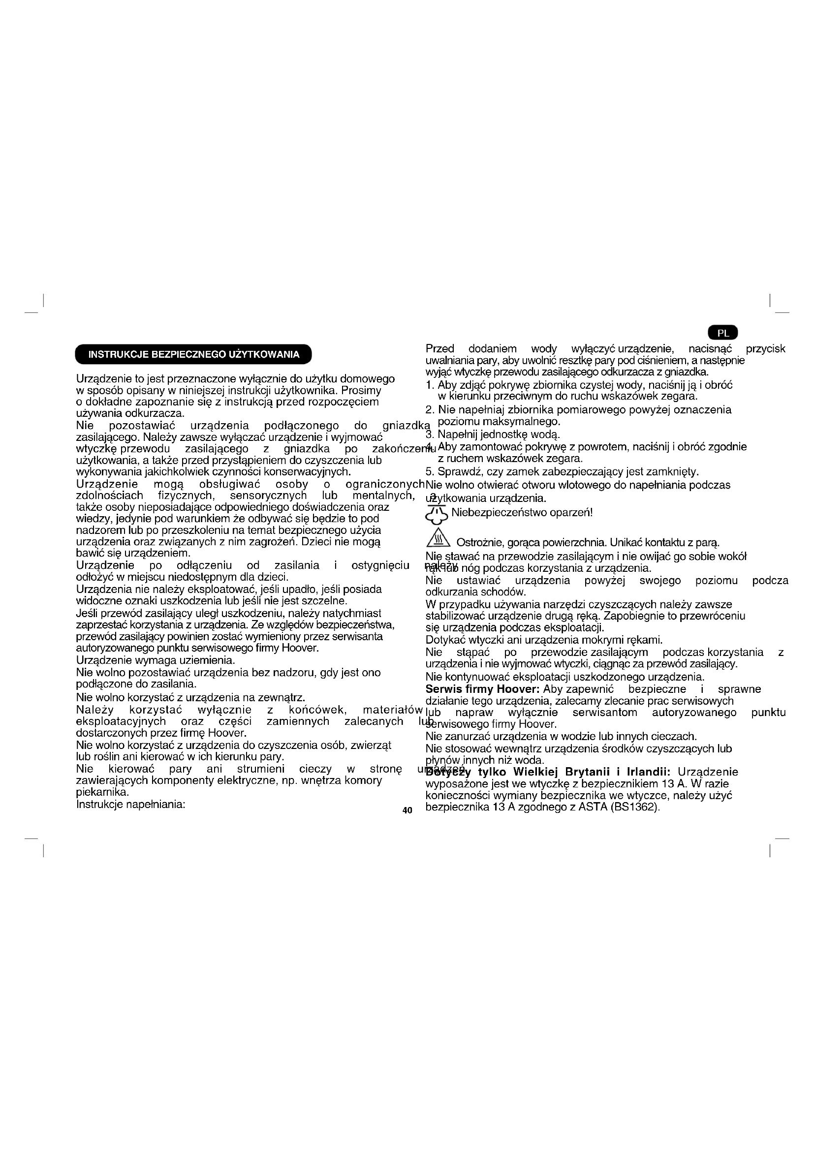 Urządzenietojestprzeznaczonewyłączniedoużytkudomowego wsposóbopisanywniniejszejinstrukcjiużytkownika.Prosimy odokładnezapoznaniesięzinstrukcjąprzedrozpoczęciem używaniaodkurzacza. Nie pozostawiać urządzenia podłączonego do gniazdka zasilającego.Należyzawszewyłączaćurządzenieiwyjmować wtyczkęprzewodu zasilającego z gniazdka po zakończeniu użytkowania,atakżeprzedprzystąpieniemdoczyszczenialub wykonywaniajakichkolwiekczynnościkonserwacyjnych. Urządzenie mogą obsługiwać osoby o ograniczonych zdolnościach fizycznych, sensorycznych lub mentalnych, a takżeosobynieposiadająceodpowiedniegodoświadczeniaoraz wiedzy,jedyniepodwarunkiemżeodbywaćsiębędzietopod nadzoremlubpoprzeszkoleniunatematbezpiecznegoużycia urządzeniaorazzwiązanychznimzagrożeń.Dzieciniemogą bawićsięurządzeniem. Urządzenie po odłączeniu od zasilania i ostygnięciu należy odłożyćwmiejscuniedostępnymdladzieci. Urządzenianienależyeksploatować,jeśliupadło,jeśliposiada widoczneoznakiuszkodzenialubjeśliniejestszczelne. Jeśliprzewódzasilającyuległuszkodzeniu,należynatychmiast zaprzestaćkorzystaniazurządzenia.Zewzględówbezpieczeństwa, przewódzasilającypowinienzostaćwymienionyprzezserwisanta autoryzowanegopunktuserwisowegormyHoover. Urządzeniewymagauziemienia. Niewolnopozostawiaćurządzeniabeznadzoru,gdyjestono podłączonedozasilania. Niewolnokorzystaćzurządzenianazewnątrz. Należy korzystać wyłącznie z końcówek, materiałów eksploatacyjnych oraz części zamiennych zalecanych lub dostarczonychprzezrmęHoover. Niewolnokorzystaćzurządzeniadoczyszczeniaosób,zwierząt lubroślinanikierowaćwichkierunkupary. Nie kierować pary ani strumieni cieczy w stronę urządzeń zawierającychkomponentyelektryczne,np.wnętrzakomory piekarnika. Instrukcjenapełniania: Przed dodaniem wody wyłączyćurządzenie, nacisnąć przycisk uwalnianiapary,abyuwolnićresztkęparypodciśnieniem,anastępnie wyjąćwtyczkęprzewoduzasilającegoodkurzaczazgniazdka. 1.Abyzdjąćpokrywęzbiornikaczystejwody,naciśnijjąiobróć w kierunku przeciwnym do ruchu wskazówek zegara. 2.Nienapełniajzbiornikapomiarowegopowyżejoznaczenia poziomu maksymalnego. 3.Napełnijjednostkęwodą. 4.Abyzamontowaćpokrywęzpowrotem,naciśnijiobróćzgodnie z ruchem wskazówek zegara. 5.Sprawdź,czyzamekzabezpieczającyjestzamknięty. Niewolnootwieraćotworuwlotowegodonapełnianiapodczas użytkowaniaurządzenia. Niebezpieczeństwooparzeń! Ostrożnie,gorącapowierzchnia.Unikaćkontaktuzparą. Niestawaćnaprzewodziezasilającyminieowijaćgosobiewokół rąklubnógpodczaskorzystaniazurządzenia. Nie ustawiać urządzenia powyżej swojego poziomu podczas odkurzania schodów. Wprzypadkuużywanianarzędziczyszczącychnależyzawsze stabilizowaćurządzeniedrugąręką.Zapobiegnietoprzewróceniu sięurządzeniapodczaseksploatacji. Dotykaćwtyczkianiurządzeniamokrymirękami. Nie stąpać po przewodziezasilającym podczaskorzystania z urządzeniainiewyjmowaćwtyczki,ciągnączaprzewódzasilający. Niekontynuowaćeksploatacjiuszkodzonegourządzenia. Serwis rmy Hoover: Abyzapewnić bezpieczne i sprawne działanietegourządzenia,zalecamyzlecaniepracserwisowych lub napraw wyłącznie serwisantom autoryzowanego punktu serwisowegormyHoover. Niezanurzaćurządzeniawwodzielubinnychcieczach. Niestosowaćwewnątrzurządzeniaśrodkówczyszczącychlub płynówinnychniżwoda. Dotyczy tylko Wielkiej Brytanii i Irlandii: Urządzenie wyposażonejestwewtyczkęzbezpiecznikiem13A.Wrazie koniecznościwymianybezpiecznikawewtyczce,należyużyć bezpiecznika 13 A zgodnego z ASTA (BS1362).41 A. Kontrolkazasilania(Czerwony)/Kontrolkagotowościpary(zielona) B. Obudowagłównaodkurzacza C. Uchwyt D. Przycisk uwalniania pary E. Pokrywazbiornikanawodę F. Pierścieńzaciskowy G. Łącznikkońcówki H. Przycisk uwalniania