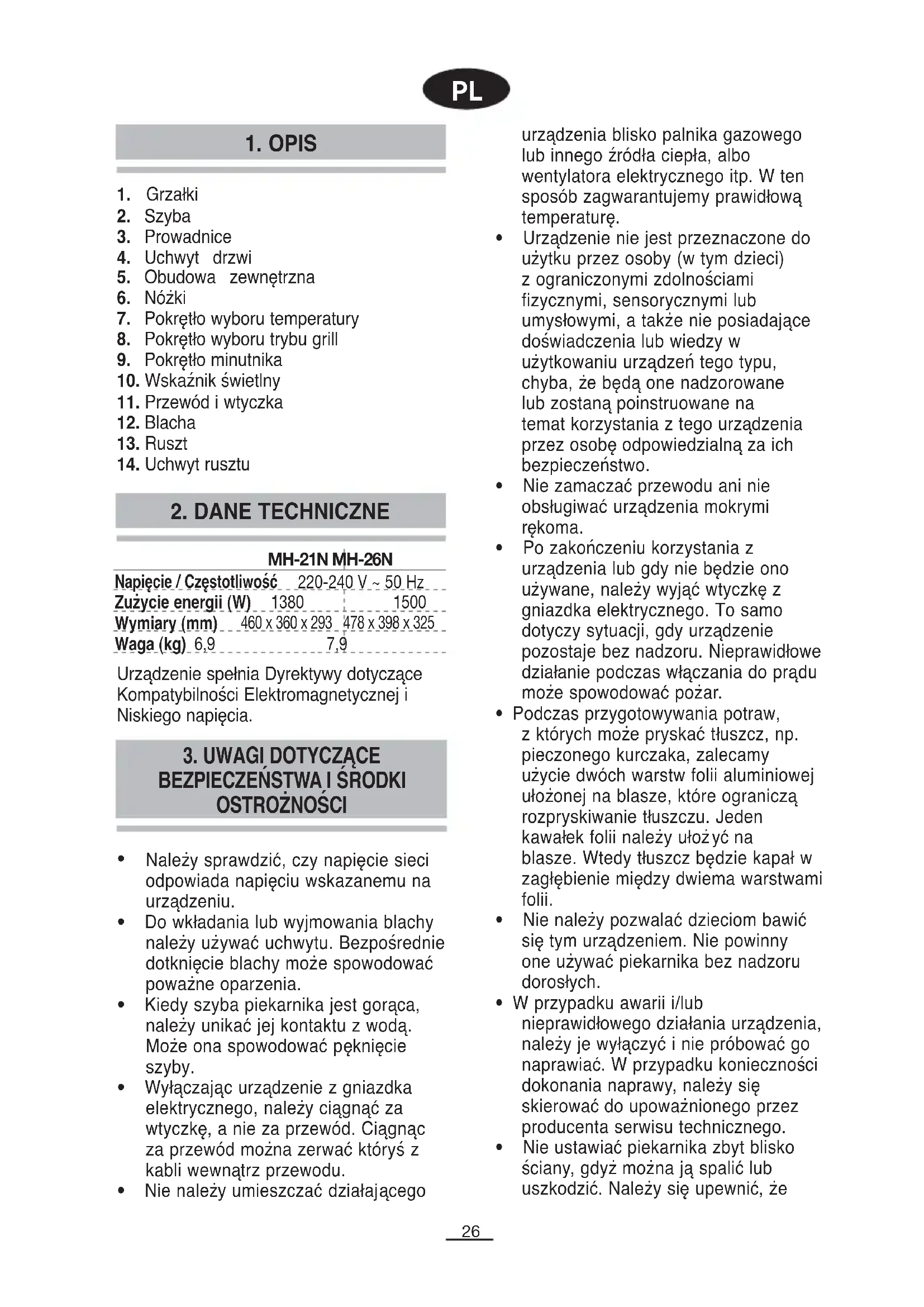 Urządzenie spełnia Dyrektywy dotyczące Kompatybilności Elektromagnetycznej i Niskiego napięcia. Napięcie / Częstotliwość 220-240 V ~ 50 Hz Zużycie energii (W) 1380 1500 Wymiary (mm) 460 x 360 x 293 478 x 398 x 325 Waga (kg) 6,9 7,9 MH-21N MH-26N27 urządzenie nie znajduje się w pobliżu zasłon i firan.
