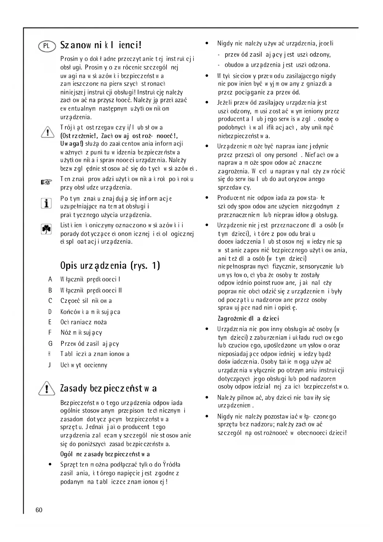 - EMC Direk tifi 89 /336/EEC ile 9 2/31/EEC ve 9 3/68/EEC sayılı ek ler60 Szanow ni k lienci! Prosim y o dok ładne przeczytanie tej instruk cji obsługi. Prosim y o zw rócenie szczególnej uw agi na w sk azów k i bezpieczeństw a zam ieszczone na pierw szych stronach niniejszej instruk cji obsługi! Instruk cję należy zach ow ać na przysz łooeć. Należy ją przek azać ew entualnym następnym użytk ow nik om urządzenia. Trójk ąt ostrzegaw czy i/lub słow a (Ostrzeżenie!, Zach ow aj ostroż- nooeć!, Uw aga!) służą do zaak centow ania inform acji w ażnych z punk tu w idzenia bezpieczeństw a użytk ow nik a i spraw nooeci urządzenia. Należy bezw zględnie stosow ać się do tych w sk azów ek . Ten znak prow adzi użytk ow nik a k rok po k rok u przy obsłudze urządzenia. Po tym znak u znajdują się inform acje uzupełniające na tem at obsługi i prak tycznego użycia urządzenia. Listk iem k oniczyny oznaczono w sk azów k i i porady dotyczące ek onom icznej i ek ologicznej ek sploatacji urządzenia. Opis urządzenia (rys. 1) A W łącznik prędk ooeci I B W łącznik prędk ooeci II C Częoeć silnik ow a D Końców k a m ik sująca E Och raniacz noża F Nóż m ik sujący G Przew ód zasilający H Tabliczk a znam ionow a J Uch w yt oecienny Zasady bezpieczeństw a Bezpieczeństw o tego urządzenia odpow iada ogólnie stosow anym przepisom tech nicznym i zasadom dotycz ącym bezpieczeństw a sprzętu. Jednak jak o producent tego urządzenia zalecam y szczególnie stosow anie się do poniższych zasad bezpieczeństw a. Ogólne zasady bezpieczeństw a