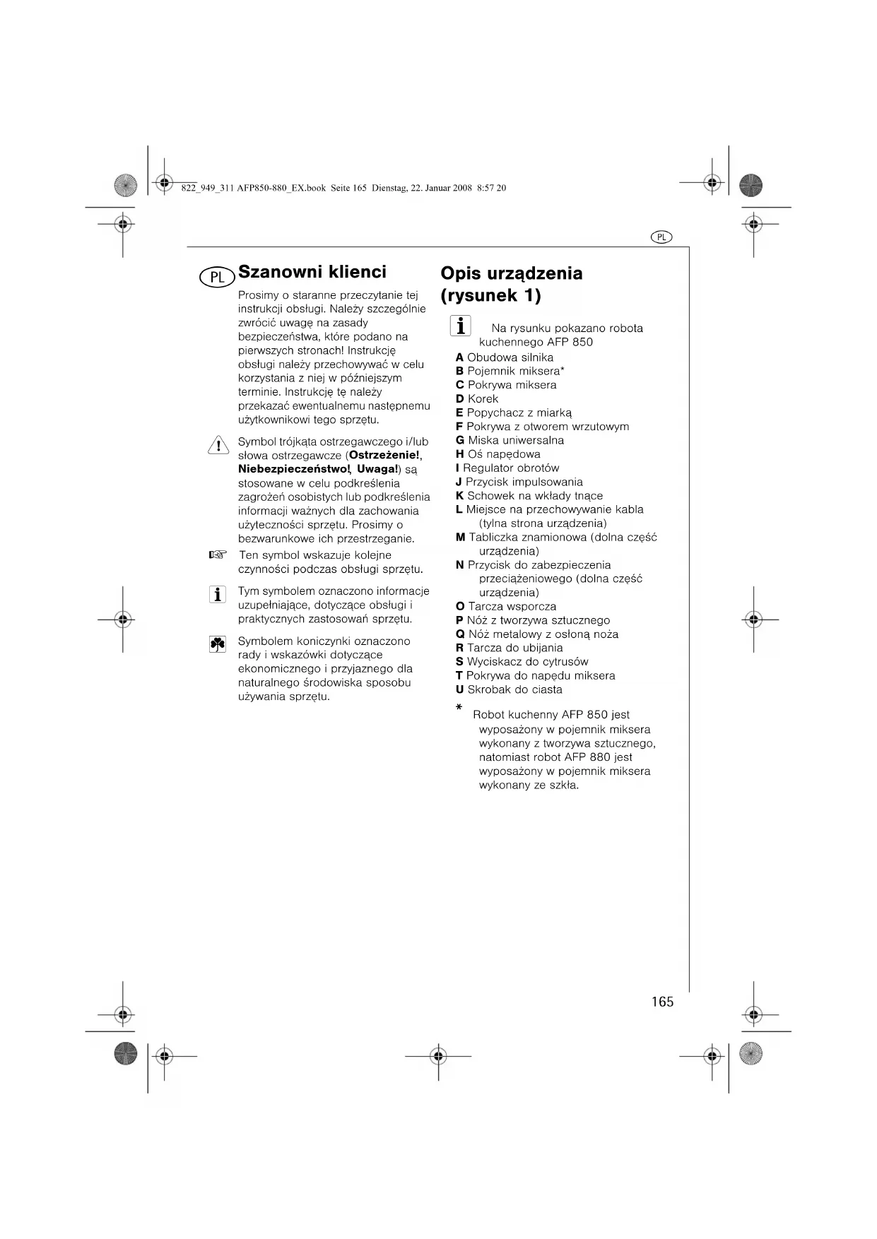 - Robot kuchenny AFP 850 jest wyposa¿ony w pojemnik miksera wykonany z tworzywa sztucznego, natomiast robot AFP 880 jest wyposa¿ony w pojemnik miksera wykonany ze szk³a. 822_949_311 AFP850-880_EX.book Seite 165 Dienstag, 22. Januar 2008 8:57 20o