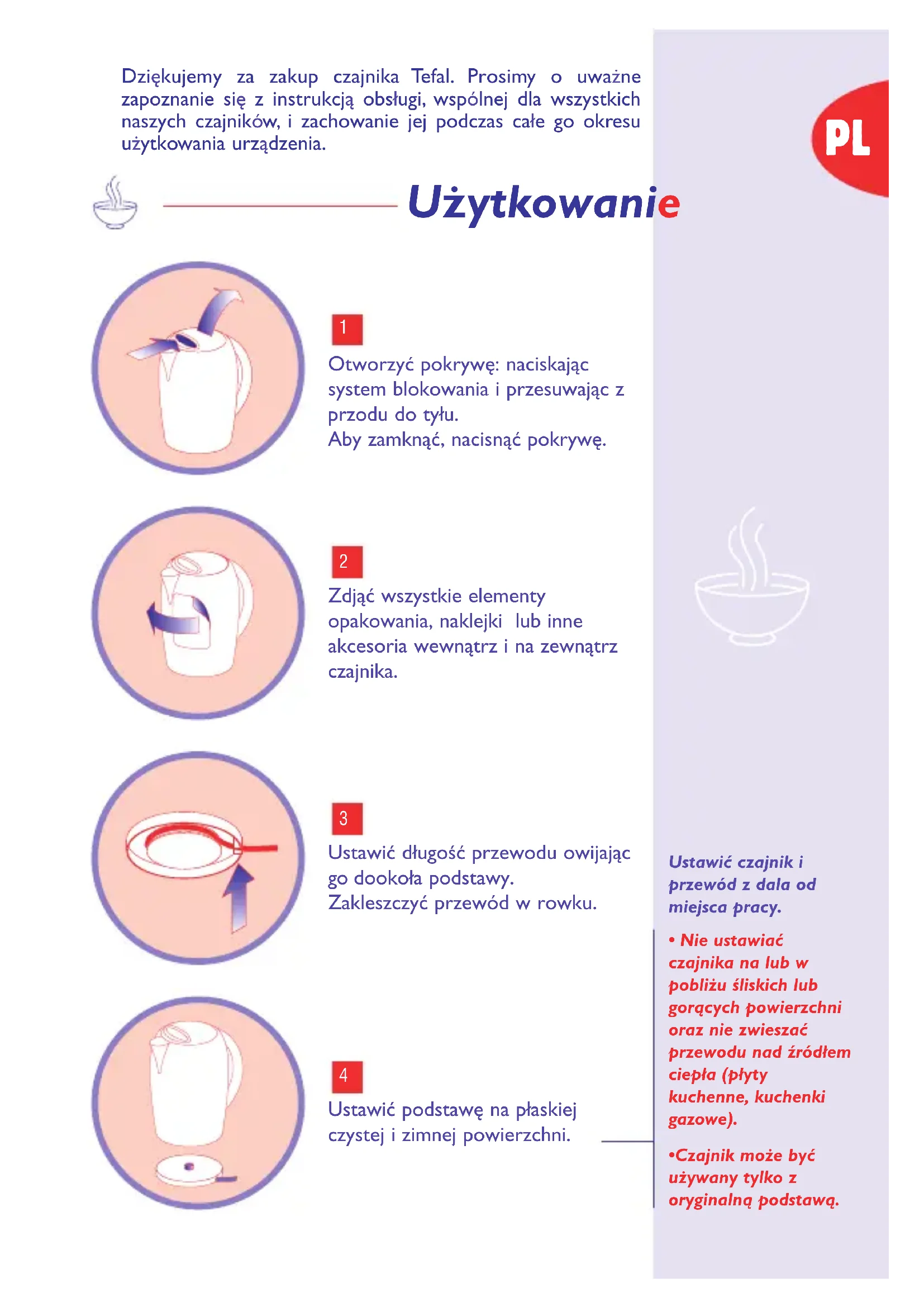 Użytkowanie Dziękujemy za zakup czajnika Tefal. Prosimy o uważne zapoznanie się z instrukcją obsługi, wspólnej dla wszystkich naszych czajników, i zachowanie jej podczas całe go okresu użytkowania urządzenia.Czajnik można napełniać przez wylewkę, zapewnia to lepszą konserwację filtra. Minimalna ilość wody musi zakryć grzałkę (lub dno czajnika).
