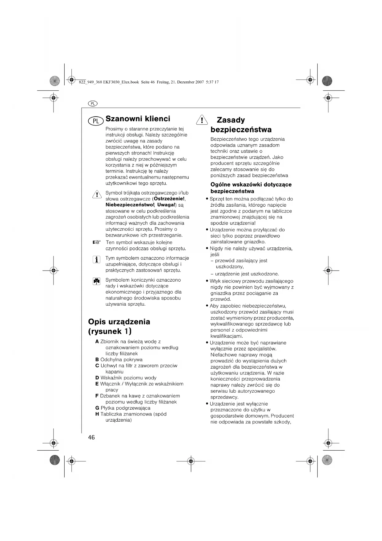 Szanowni klienci Prosimy o staranne przeczytanie tej instrukcji obs³ugi. Nale¿y szczególnie zwróciæ uwagê na zasady bezpieczeñstwa, które podano na pierwszych stronach! Instrukcjê obs³ugi nale¿y przechowywaæ w celu korzystania z niej w póŸniejszym terminie. Instrukcjê tê nale¿y przekazaæ ewentualnemu nastêpnemu u¿ytkownikowi tego sprzêtu. Symbol trójk¹ta ostrzegawczego i/lub s³owa ostrzegawcze (Ostrze¿enie! Niebezpieczeñstwo! Uwaga!) s¹ stosowane w celu podkreœlenia zagro¿eñ osobistych lub podkreœlenia informacji wa¿nych dla zachowania u¿ytecznoœci sprzêtu. Prosimy o bezwarunkowe ich przestrzeganie.0 Ten symbol wskazuje kolejne czynnoœci podczas obs³ugi sprzêtu. Tym symbolem oznaczono informacje uzupe³niaj¹ce, dotycz¹ce obs³ugi i praktycznych zastosowañ sprzêtu. Symbolem koniczynki oznaczono rady i wskazówki dotycz¹ce ekonomicznego i przyjaznego dla naturalnego œrodowiska sposobu u¿ywania sprzêtu. Opis urz¹dzenia (rysunek 1) A Zbiornik na œwie¿¹ wodê z oznakowaniem poziomu wed³ug liczby fili¿anekB Odchylna pokrywaC Uchwyt na filtr z zaworem przeciw kapaniuD WskaŸnik poziomu wodyE W³¹cznik / Wy³¹cznik ze wskaŸnikiem pracyF Dzbanek na kawê z oznakowaniem poziomu wed³ug liczby fili¿anekG P³ytka podgrzewaj¹caH Tabliczka znamionowa (spód urz¹dzenia) 1 Zasady bezpieczeñstwa Bezpieczeñstwo tego urz¹dzenia odpowiada uznanym zasadom techniki oraz ustawie o bezpieczeñstwie urz¹dzeñ. Jako producent sprzêtu szczególnie zalecamy stosowanie siê do poni¿szych zasad bezpieczeñstwaOgólne wskazówki dotycz¹ce bezpieczeñstwa• Sprzêt ten mo¿na pod³¹czaæ tylko do Ÿród³a zasilania, którego napiêcie jest zgodne z podanym na tabliczce znamionowej znajduj¹cej siê na spodzie urz¹dzenia!• Urz¹dzenie mo¿na przy³¹czaæ do sieci tylko poprzez prawid³owo zainstalowane gniazdko.• Nigdy nie nale¿y u¿ywaæ urz¹dzenia, jeœli– przewód zasilaj¹cy jest uszkodzony,– urz¹dzenie jest uszkodzone.• Wtyk sieciowy przewodu zasilaj¹cego nigdy nie powinien byæ wyjmowany z gniazdka przez poci¹ganie za przewód.• Aby zapobiec niebezpieczeñstwu, uszkodzony przewód zasilaj¹cy musi zostaæ wymieniony przez producenta, wykwalifikowanego sprzedawcê lub personel z odpowiednimi kwalifikacjami.• Urz¹dzenie mo¿e byæ naprawiane wy³¹cznie przez specjalistów. Niefachowe naprawy mog¹ prowadziæ do wyst¹pienia du¿ych zagro¿eñ dla bezpieczeñstwa w u¿ytkowaniu urz¹dzenia. W razie koniecznoœci przeprowadzenia naprawy nale¿y zwróciæ siê do serwisu lub autoryzowanego sprzedawcy.• Urz¹dzenie jest wy³¹cznie przeznaczone do u¿ytku w gospodarstwie domowym. Producent nie odpowiada za powsta³e szkody, 822_949_368 EKF3030_Elux.book Seite 46 Freitag, 21. Dezember 2007 5:37 17o