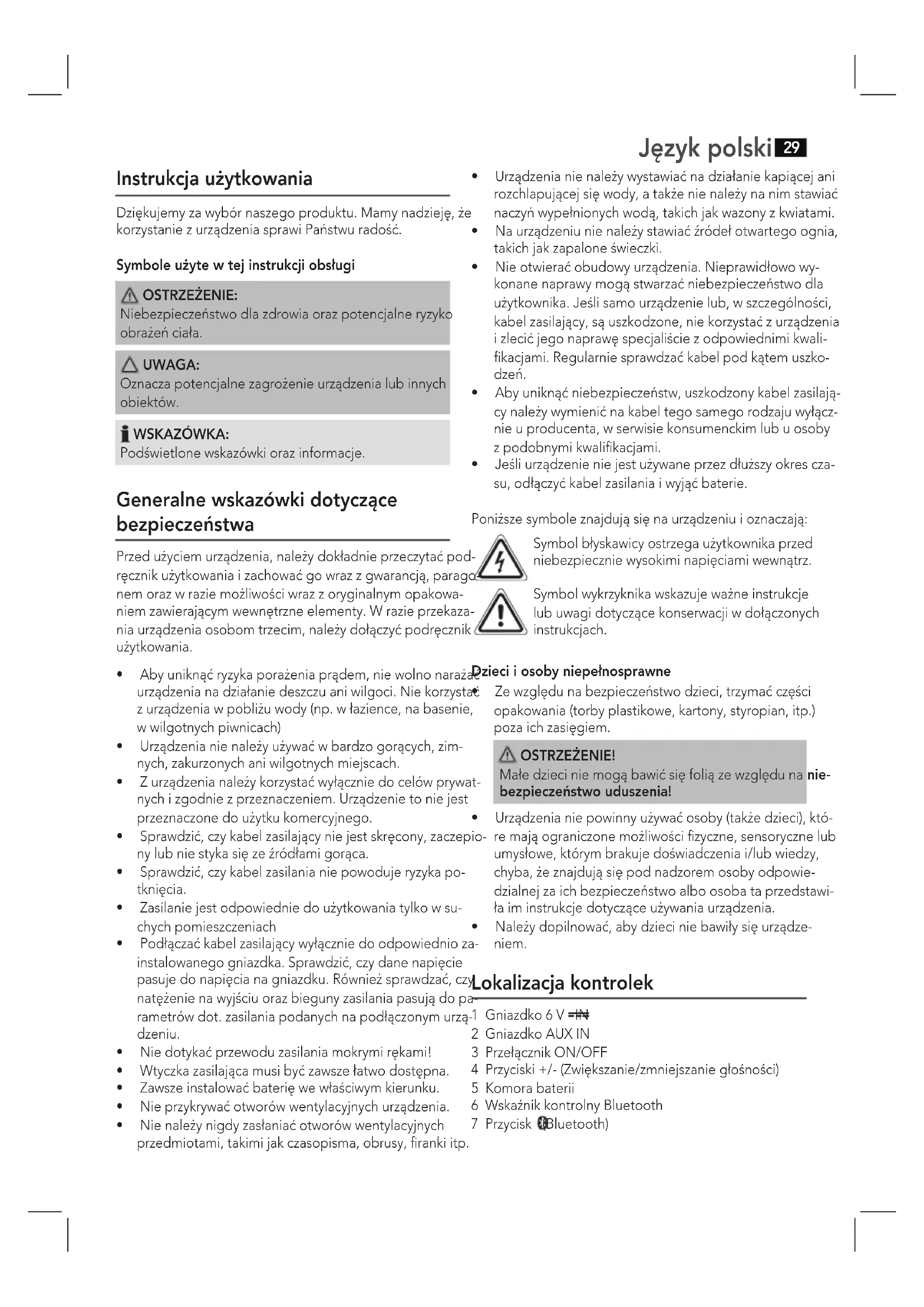 - Urzadzenia nie powinny uzywac osoby (takze daneci), kóre majora ograniczone moziwość fizyczne, sensoryczne lub umysłowe, tkorym brakuje doswiadzenia i/lub wiedzy, chyba, zeznajduja sie pod nadzorem osoby odpowiedzialnej za ich bezpieczentwo albo osoba ta przystawiţa im instrukcje dotyczne uzywania urzadzenia.