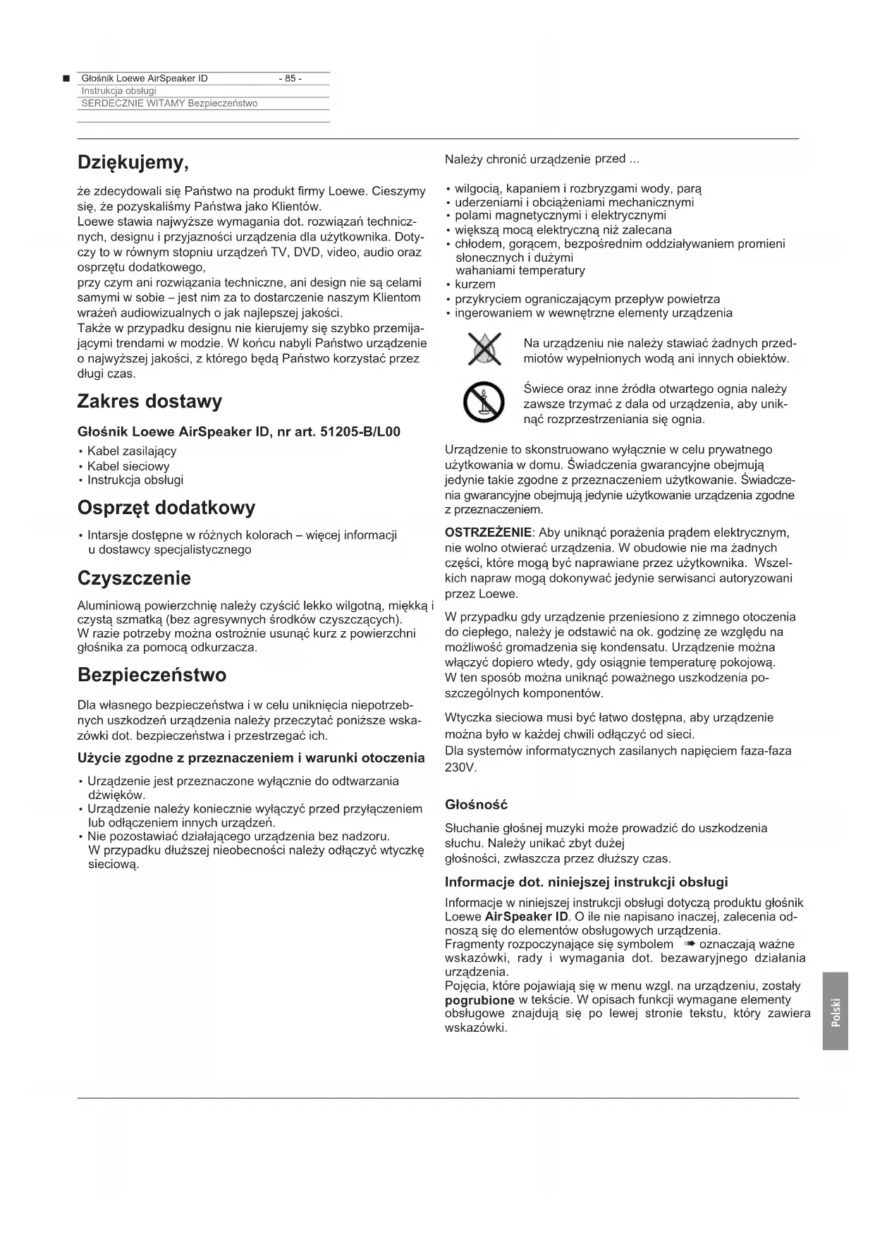 - 85 -Instrukcja obsługiSERDECZNIE WITAMY Bezpieczeństwo Dziękujemy, że zdecydowali się Państwo na produkt rmy Loewe. Cieszymy się, że pozyskaliśmy Państwa jako Klientów. Loewe stawia najwyższe wymagania dot. rozwiązań technicz- nych, designu i przyjazności urządzenia dla użytkownika. Doty- czy to w równym stopniu urządzeń TV, DVD, video, audio oraz osprzętu dodatkowego, przy czym ani rozwiązania techniczne, ani design nie są celami samymi w sobie – jest nim za to dostarczenie naszym Klientom wrażeń audiowizualnych o jak najlepszej jakości. Także w przypadku designu nie kierujemy się szybko przemija- jącymi trendami w modzie. W końcu nabyli Państwo urządzenie o najwyższej jakości, z którego będą Państwo korzystać przez długi czas. Zakres dostawy Głośnik Loewe AirSpeaker ID, nr art. 51205-B/L00