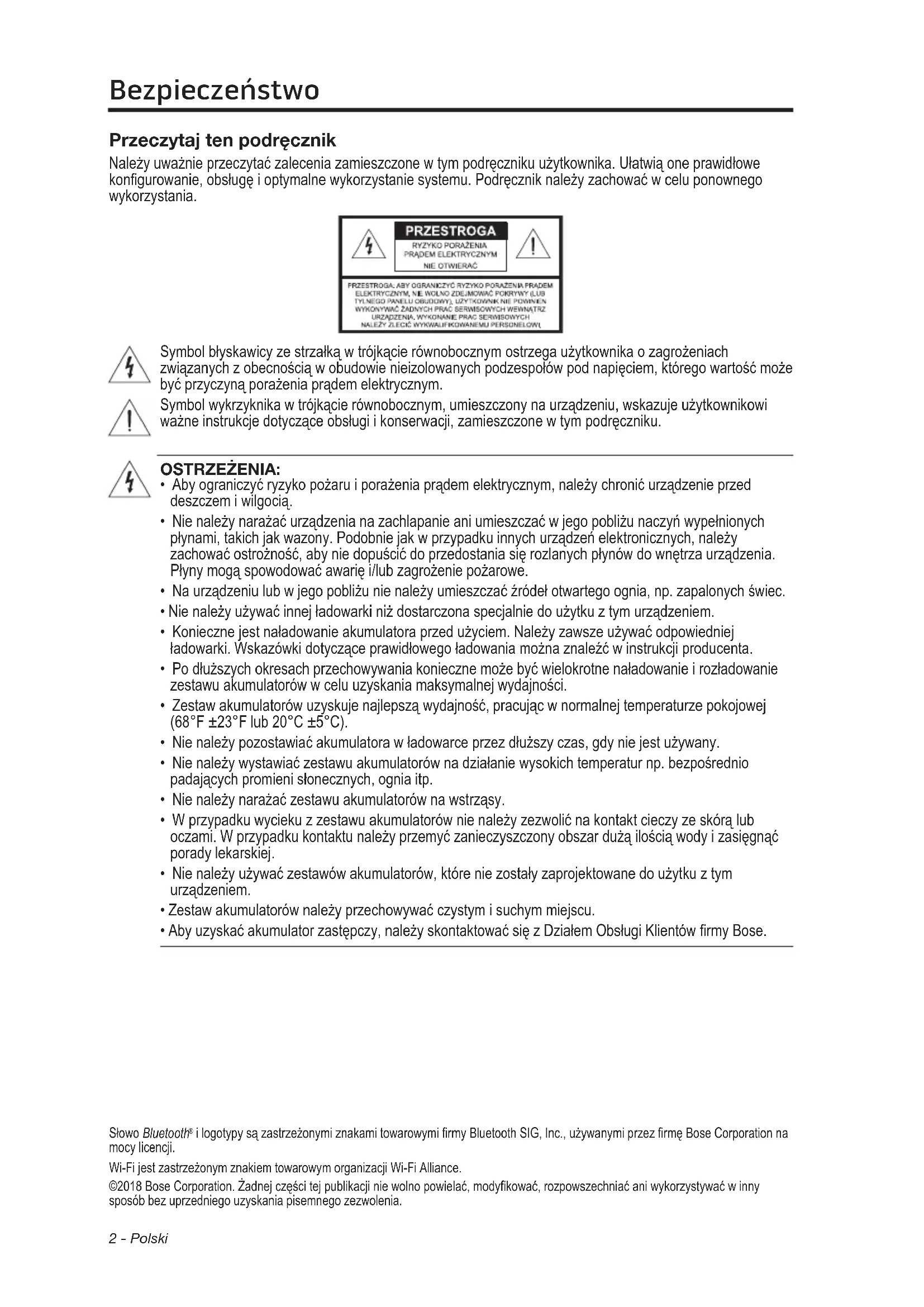 i logotypy są zastrzeżonymi znakami towarowymi rmy Bluetooth SIG, Inc., używanymi przez rmę Bose Corporation na mocy licencji. Wi-Fi jest zastrzeżonym znakiem towarowym organizacji Wi-Fi Alliance. ©2018 Bose Corporation. Żadnej części tej publikacji nie wolno powielać, modykować, rozpowszechniać ani wykorzystywać w inny sposób bez uprzedniego uzyskania pisemnego zezwolenia.Polski - 3 Bezpieczeństwo OSTRZEŻENIE: Produkt zawiera elementy magnetyczne. Wszelkie wątpliwości dotyczące wpływu tych elementów na funkcjonowanie implantów medycznych należy skonsultować z lekarzem. PRZESTROGA: Nie należy modykować systemu lub akcesoriów. Nieautoryzowane modykacje mogą niekorzystnie wpływać na bezpieczeństwo, zgodność z przepisami i wydajność systemu. UWAGI: