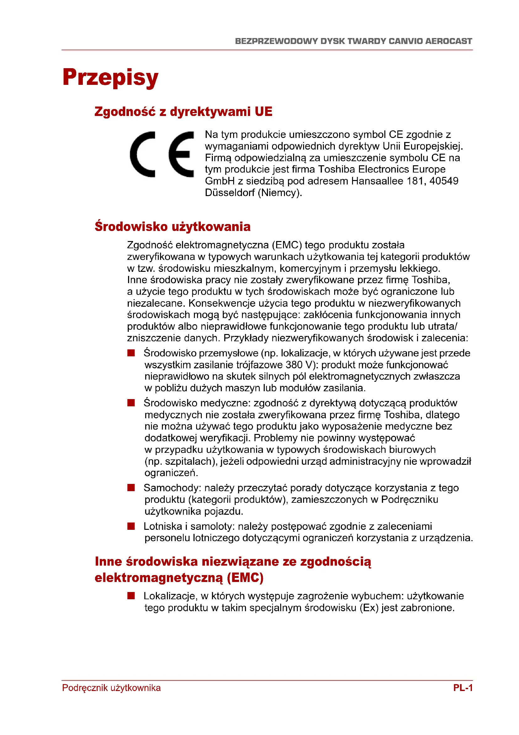 Podręcznik użytkownika Przepisy Zgodność z dyrektywami UE Środowisko użytkowania Zgodność elektromagnetyczna (EMC) tego produktu została zweryfikowana w typowych warunkach użytkowania tej kategorii produktów wtzw. środowisku mieszkalnym, komercyjnym i przemysłu lekkiego. Inne środowiska pracy nie zostały zweryfikowane przez firmę Toshiba, aużycie tego produktu w tych środowiskach może być ograniczone lub niezalecane. Konsekwencje użycia tego produktu w niezweryfikowanych środowiskach mogą być następujące: zakłócenia funkcjonowania innych produktów albo nieprawidłowe funkcjonowanie tego produktu lub utrata/ zniszczenie danych. Przykłady niezweryfikowanych środowisk i zalecenia: ■ Środowisko przemysłowe (np. lokalizacje, w których używane jest przede wszystkim zasilanie trójfazowe 380 V): produkt może funkcjonować nieprawidłowo na skutek silnych pól elektromagnetycznych zwłaszcza w pobliżu dużych maszyn lub modułów zasilania. ■ Środowisko medyczne: zgodność z dyrektywą dotyczącą produktów medycznych nie została zweryfikowana przez firmę Toshiba, dlatego nie można używać tego produktu jako wyposażenie medyczne bez dodatkowej weryfikacji. Problemy nie powinny występować w przypadku użytkowania w typowych środowiskach biurowych (np. szpitalach), jeżeli odpowiedni urząd administracyjny nie wprowadził ograniczeń. ■ Samochody: należy przeczytać porady dotyczące korzystania z tego produktu (kategorii produktów), zamieszczonych w Podręczniku użytkownika pojazdu. ■ Lotniska i samoloty: należy postępować zgodnie z zaleceniami personelu lotniczego dotyczącymi ograniczeń korzystania z urządzenia. Inne środowiska niezwiązane ze zgodnością elektromagnetyczną (EMC) ■ Lokalizacje, w których występuje zagrożenie wybuchem: użytkowanie tego produktu w takim specjalnym środowisku (Ex) jest zabronione. Na tym produkcie umieszczono symbol CE zgodnie z wymaganiami odpowiednich dyrektyw Unii Europejskiej. Firmą odpowiedzialną za umieszczenie symbolu CE na tym produkcie jest firma Toshiba Electronics Europe GmbH z siedzibą pod adresem Hansaallee 181, 40549 Düsseldorf (Niemcy).Podręcznik użytkownika PL-2