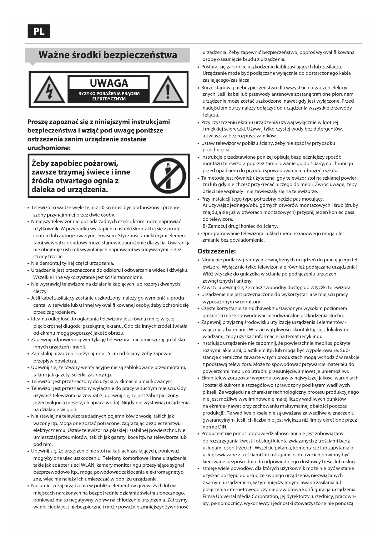 - Nigdy nie podłączaj żadnych zewnętrznych urządzeń do pracującego tel-ewizora. Wyłącz nie tylko telewizor, ale również podłączane urządzenia! Włóż wtyczkę do gniazdka w ścianie po podłączeniu urządzeń zewnętrznych ianteny!• Zawsze upewnij się, że masz swobodny dostęp do wtyczki telewizora.• Urządzenie nie jest przeznaczone do wykorzystania w miejscu pracy wyposażonym w monitory.• Częste korzystanie ze słuchawek zustawionym wysokim poziomem głośności może spowodować nieodwracalne uszkodzenia słuchu.• Zapewnij przyjazną środowisku utylizację urządzenia ielementów - włącznie zbateriami. W razie wątpliwości skontaktuj się zlokalnymi władzami, żeby uzyskać informacje na temat recyklingu.• Instalując urządzenie nie zapomnij, że powierzchnie mebli są pokryte różnymi lakierami, plastikiem itp. lub mogą być wypolerowane. Sub-stancje chemiczne zawarte w tych produktach mogą wchodzić w reakcje zpodstawą telewizora. Może to spowodować przywarcie materiału do powierzchni mebli, co utrudni przesunięcie, anawet je uniemożliwi.• Ekran telewizora został wyprodukowany w najwyższej jakości warunkach izostał kilkukrotnie szczegółowo sprawdzony pod kątem wadliwych pikseli. Ze względu na charakter technologiczny procesu produkcyjnego nie jest możliwe wyeliminowanie małej liczby wadliwych punktów na ekranie (nawet przy zachowaniu maksymalnej dbałości podczas produkcji). Te wadliwe piksele nie są uważane za wadliwe w znaczeniu gwarancyjnym, jeśli ich liczba nie jest większa niż limity określone przez normę DIN.• Producent nie ponosi odpowiedzialności ani nie jest zobowiązany do rozstrzygania kwestii obsługi klienta związanych z treściami bądź usługami osób trzecich. Wszelkie pytania, komentarze lub zapytania o usługi związane z treściami lub usługami osób trzecich powinny być kierowane bezpośrednio do odpowiedniego dostawcy treści lub usług.• Istnieje wiele powodów, dla których użytkownik może nie być w stanie uzyskać dostępu do usług ze swojego urządzenia, niezwiązanych z samym urządzeniem, w tym między innymi awaria zasilania lub połączenia internetowego czy nieprawidłowa kon guracja urządzenia. Firma Universal Media Corporation, jej dyrektorzy, urzędnicy, pracown-icy, pełnomocnicy, wykonawcy i jednostki stowarzyszone nie ponoszą53 odpowiedzialności przed użytkownikiem ani osobą trzecią w przypadku wspomnianych awarii lub przestojów, niezależnie od powodów awarii oraz tego, czy można było jej uniknąć.