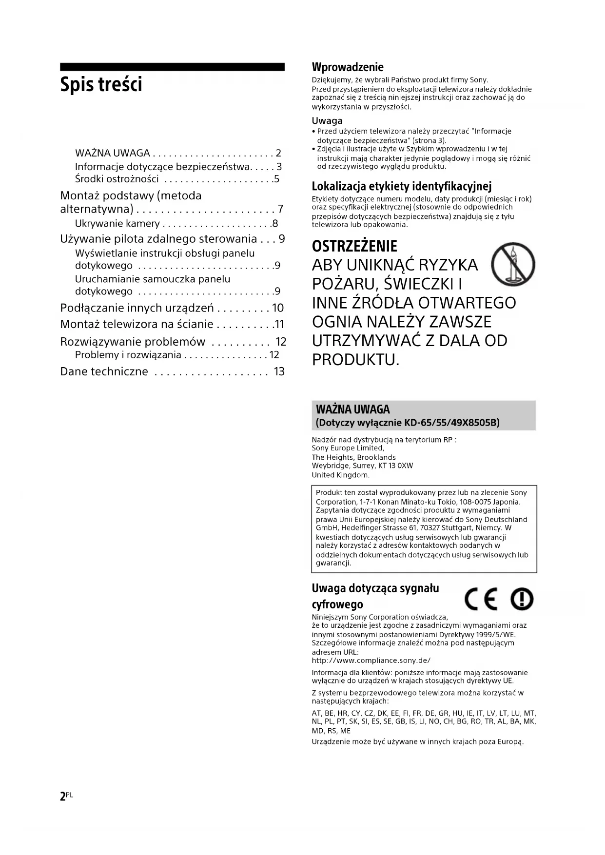 (Dotyczy wyłącznie KD-65/55/49X8505B)Produkt ten został wyprodukowany przez lub na zlecenie Sony Corporation, 1-7-1 Konan Minato-ku Tokio, 108-0075 Japonia. Zapytania dotyczące zgodności produktu z wymaganiami prawa Unii Europejskiej należy kierować do Sony Deutschland GmbH, Hedelfinger Strasse 61, 70327 Stuttgart, Niemcy. W kwestiach dotyczących usług serwisowych lub gwarancji należy korzystać z adresów kontaktowych podanych w oddzielnych dokumentach dotyczących usług serwisowych lub gwarancji.3
