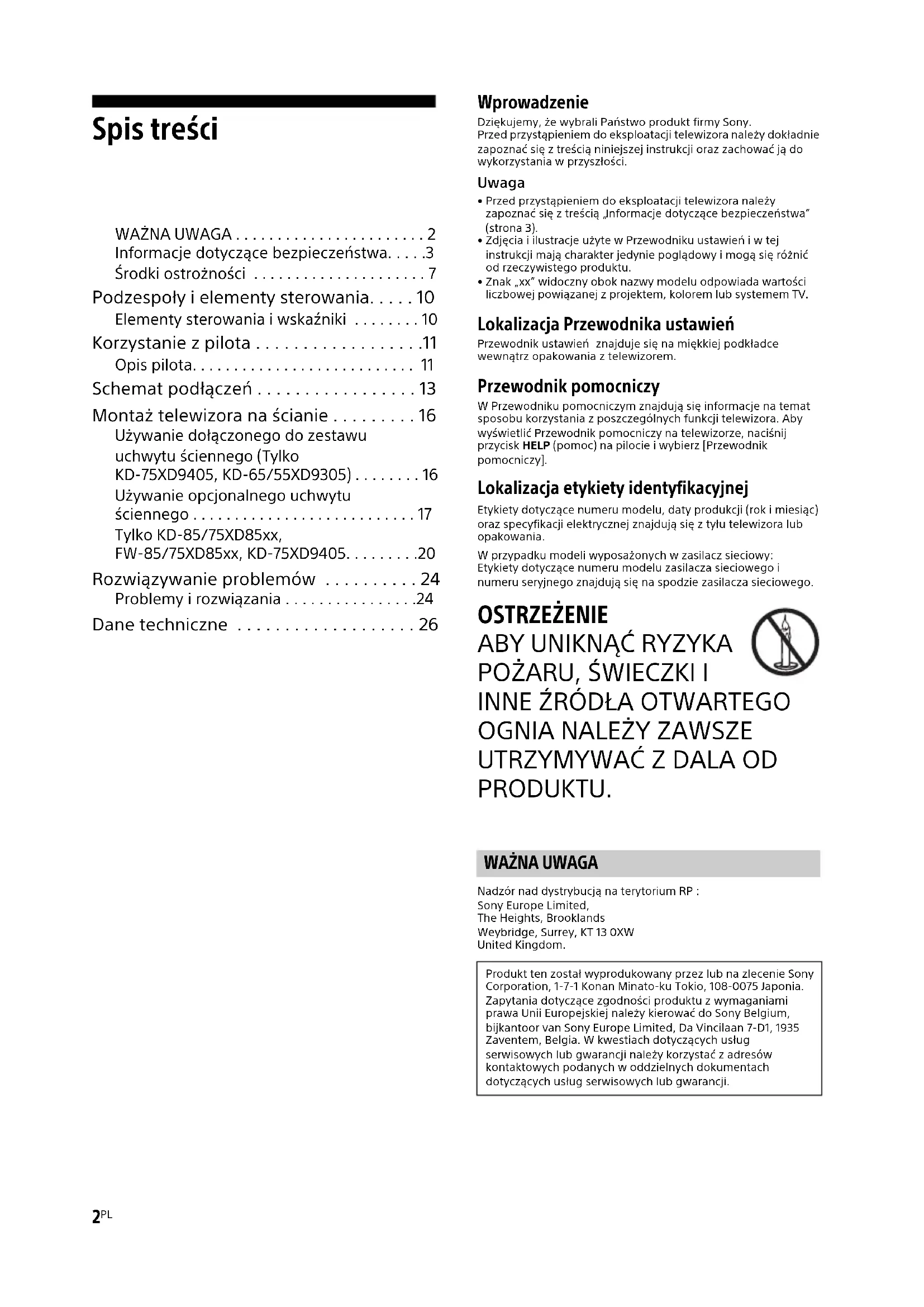 Uwaga dotycząca sygnału cyfrowego Niniejszym Sony Corporation oświadcza, że to urządzenie jest zgodne z zasadniczymi wymaganiami oraz innymi stosownymi postanowieniami Dyrektywy 1999/5/WE. Szczegółowe informacje znaleźć można pod następującym adresem URL: http://www.compliance.sony.de/ Informacja dla klientów: poniższe informacje mają zastosowanie wyłącznie do urządzeń w krajach stosujących dyrektywy UE. Z systemu bezprzewodowego telewizora można korzystać w następujących krajach: AT, BE, HR, CY, CZ, DK, EE, FI, FR, DE, GR, HU, IE, IT, LV, LT, LU, MT, NL, PL, PT, SK, SI, ES, SE, GB, IS, LI, NO, CH, BG, RO, TR, AL, BA, MK, MD, RS, ME, Kosovo Urządzenie może być używane w innych krajach poza Europą. OSTRZEŻENIE Nie wolno narażać baterii na działanie zbyt wysokich temperatur przez ekspozycję na słońce, ogień itd. Nigdy nie należy umieszczać telewizora w niestabilnym miejscu. Telewizor może się przewrócić, powodując poważne obrażenia lub śmierć. Wielu obrażeń, szczególnie u dzieci, można uniknąć stosując takie proste środki ostrożności jak: Korzystanie z szafek lub stojaków zalecanych przez producenta telewizora. Korzystanie wyłącznie z mebli, które mogą bezpiecznie udźwignąć telewizor. Upewnienie się, że telewizor nie wystaje nad krawędź mebli, na których spoczywa. Nieumieszczanie telewizora na wysokich meblach (np. kredensach lub szafkach na książki), jeśli meble i telewizor nie zostały zaczepione o odpowiednie oparcie. Nieumieszczanie telewizora na obrusie lub innych materiałach, które mogą się znajdować pomiędzy telewizorem i meblem, na którym stoi. Wyjaśnienie dzieciom niebezpieczeństwa związanego ze wspinaniem się na mebel w celu sięgnięcia telewizora lub jego elementów sterowania. Jeśli pozostał stary telewizor i jest on przenoszony do innego miejsca, obowiązują te same wskazówki. Montaż i instalacja Aby uniknąć ryzyka wybuchu pożaru, porażenia prądem elektrycznym, uszkodzenia sprzętu i/lub ewentualnych obrażeń ciała, odbiornik TV należy zainstalować zgodnie z instrukcjami podanymi poniżej. Instalacja