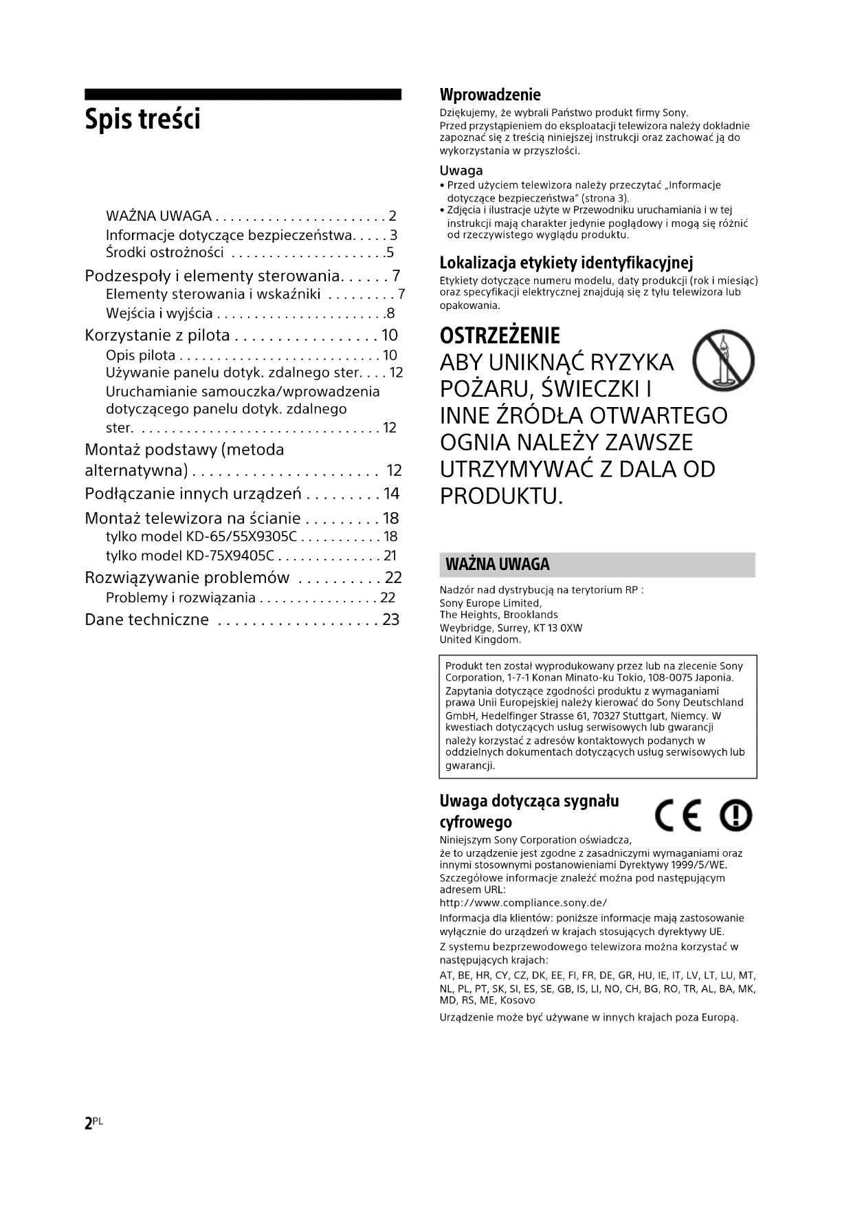 PRODUKTU. Nadzór nad dystrybucją na terytorium RP :Sony Europe Limited,The Heights, BrooklandsWeybridge, Surrey, KT 13 0XWUnited Kingdom. Uwaga dotycząca sygnału cyfrowego Niniejszym Sony Corporation oświadcza, że to urządzenie jest zgodne z zasadniczymi wymaganiami oraz innymi stosownymi postanowieniami Dyrektywy 1999/5/WE.Szczegółowe informacje znaleźć można pod następującym adresem URL:http://www.compliance.sony.de/Informacja dla klientów: poniższe informacje mają zastosowanie wyłącznie do urządzeń w krajach stosujących dyrektywy UE.Z systemu bezprzewodowego telewizora można korzystać w następujących krajach:AT, BE, HR, CY, CZ, DK, EE, FI, FR, DE, GR, HU, IE, IT, LV, LT, LU, MT, NL, PL, PT, SK, SI, ES, SE, GB, IS, LI, NO, CH, BG, RO, TR, AL, BA, MK, MD, RS, ME, KosovoUrządzenie może być używane w innych krajach poza Europą.