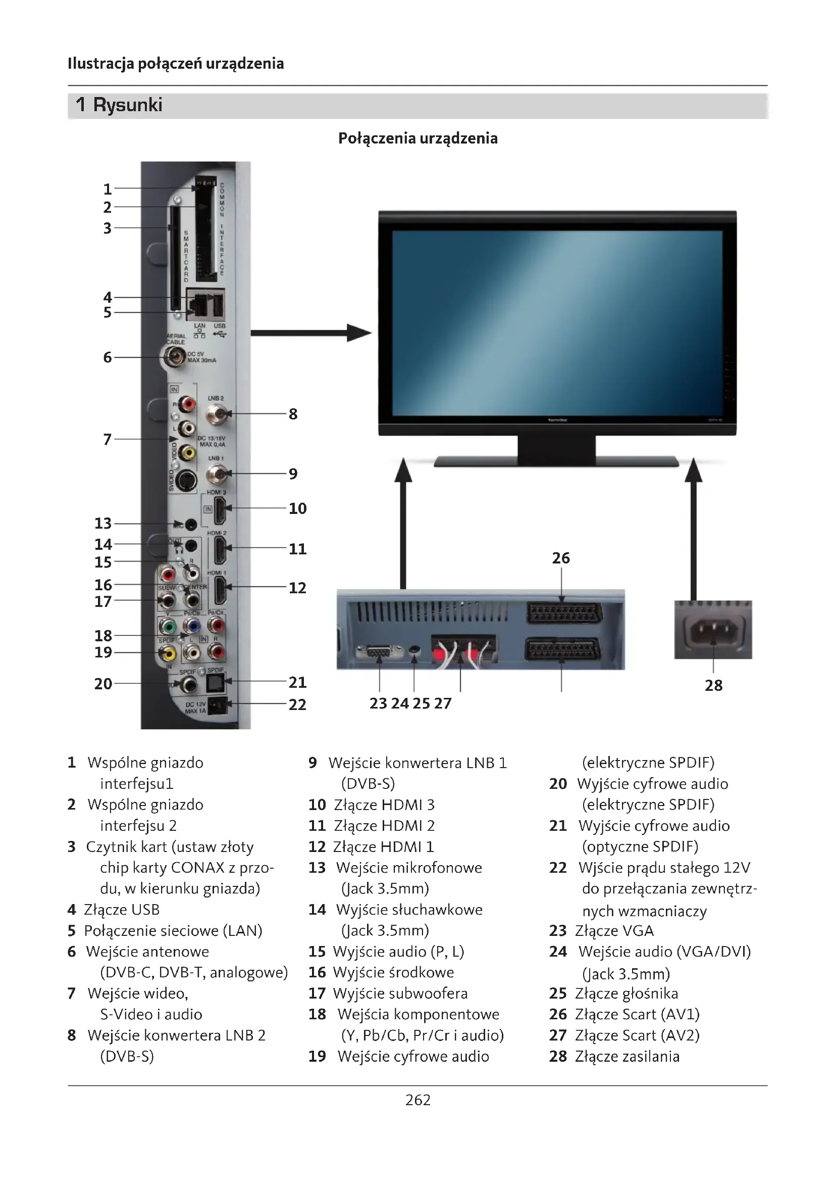- 0,14 EUR/min. Deutschen Telekom AG:n kaapeliverkossa. Matkapuheluiden ja ulkomaan puheluiden hinnat voivat vaihdella. 604_23806ENFRESITGRNLNODASVFIPLCZHURU Skrócona instrukcja uruchomienia HDTV 46 HDTV 40 / HDTV 40 Plus HDTV 32 / HDTV 32 Plus262 1 Rysunki Połączenia urządzenia Ilustracja połączeń urządzenia 1 Wspólne gniazdo interfejsu1 2 Wspólne gniazdo interfejsu 2 3 Czytnik kart (ustaw złoty chip karty CONAX z przo- du, w kierunku gniazda) 4 Złącze USB 5 Połączenie sieciowe (LAN) 6 Wejście antenowe (DVB-C, DVB-T, analogowe) 7 Wejście wideo, S-Video i audio 8 Wejście konwertera LNB 2 (DVB-S) 9 Wejście konwertera LNB 1 (DVB-S) 10 Złącze HDMI 3 11 Złącze HDMI 2 12 Złącze HDMI 1 13 Wejście mikrofonowe (Jack 3.5mm) 14 Wyjście słuchawkowe (Jack 3.5mm) 15 Wyjście audio (P, L) 16 Wyjście środkowe 17 Wyjście subwoofera 18 Wejścia komponentowe (Y, Pb/Cb, Pr/Cr i audio) 19 Wejście cyfrowe audio (elektryczne SPDIF) 20 Wyjście cyfrowe audio (elektryczne SPDIF) 21 Wyjście cyfrowe audio (optyczne SPDIF) 22 Wjście prądu stałego 12V do przełączania zewnętrz- nych wzmacniaczy 23 Złącze VGA 24 Wejście audio (VGA/DVI) (Jack 3.5mm) 25 Złącze głośnika 26 Złącze Scart (AV1) 27 Złącze Scart (AV2) 28 Złącze zasilania