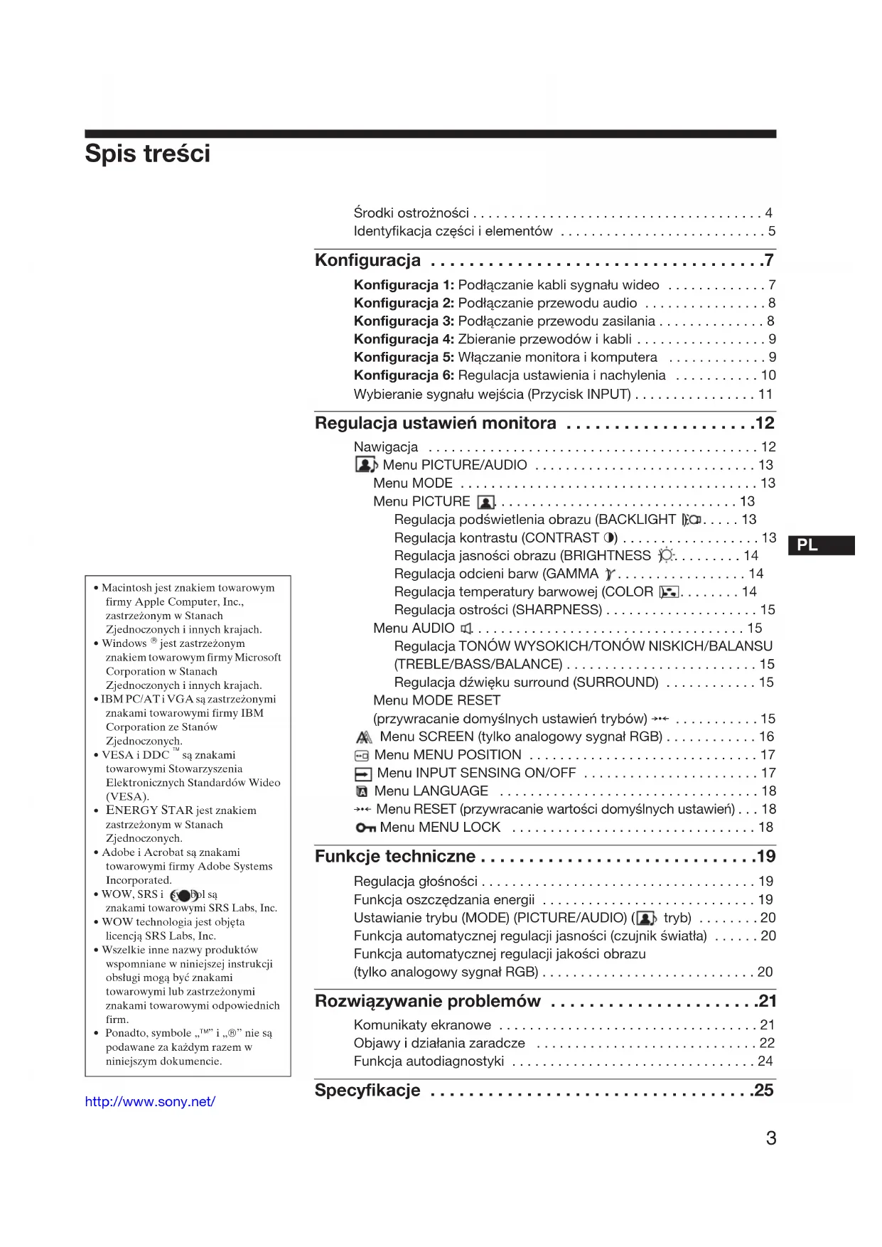 - Ponadto, symbole „” i „” nie są podawane za każdym razem w niniejszym dokumencie. http://www.sony.net/ Środki ostrożności . . . . . . . . . . . . . . . . . . . . . . . . . . . . . . . . . . . . . . 4 Identyfikacja części i elementów . . . . . . . . . . . . . . . . . . . . . . . . . . . 5 Konfiguracja . . . . . . . . . . . . . . . . . . . . . . . . . . . . . . . . . . .7 Konfiguracja 1: Podłączanie kabli sygnału wideo . . . . . . . . . . . . . 7 Konfiguracja 2: Podłączanie przewodu audio . . . . . . . . . . . . . . . . 8 Konfiguracja 3: Podłączanie przewodu zasilania . . . . . . . . . . . . . . 8 Konfiguracja 4: Zbieranie przewodów i kabli . . . . . . . . . . . . . . . . . 9 Konfiguracja 5: Włączanie monitora i komputera . . . . . . . . . . . . . 9 Konfiguracja 6: Regulacja ustawienia i nachylenia . . . . . . . . . . . 10 Wybieranie sygnału wejścia (Przycisk INPUT) . . . . . . . . . . . . . . . . 11 Regulacja ustawień monitora . . . . . . . . . . . . . . . . . . . .12 Nawigacja . . . . . . . . . . . . . . . . . . . . . . . . . . . . . . . . . . . . . . . . . . . 12 Menu PICTURE/AUDIO . . . . . . . . . . . . . . . . . . . . . . . . . . . . . 13 Menu MODE . . . . . . . . . . . . . . . . . . . . . . . . . . . . . . . . . . . . . . . 13 Menu PICTURE . . . . . . . . . . . . . . . . . . . . . . . . . . . . . . . . . 13 Regulacja podświetlenia obrazu (BACKLIGHT ) . . . . . . 13 Regulacja kontrastu (CONTRAST 6) . . . . . . . . . . . . . . . . . . 13 Regulacja jasności obrazu (BRIGHTNESS ) . . . . . . . . . 14 Regulacja odcieni barw (GAMMA ) . . . . . . . . . . . . . . . . . 14 Regulacja temperatury barwowej (COLOR ) . . . . . . . . . 14 Regulacja ostrości (SHARPNESS) . . . . . . . . . . . . . . . . . . . . 15 Menu AUDIO . . . . . . . . . . . . . . . . . . . . . . . . . . . . . . . . . . . . . 15 Regulacja TONÓW WYSOKICH/TONÓW NISKICH/BALANSU