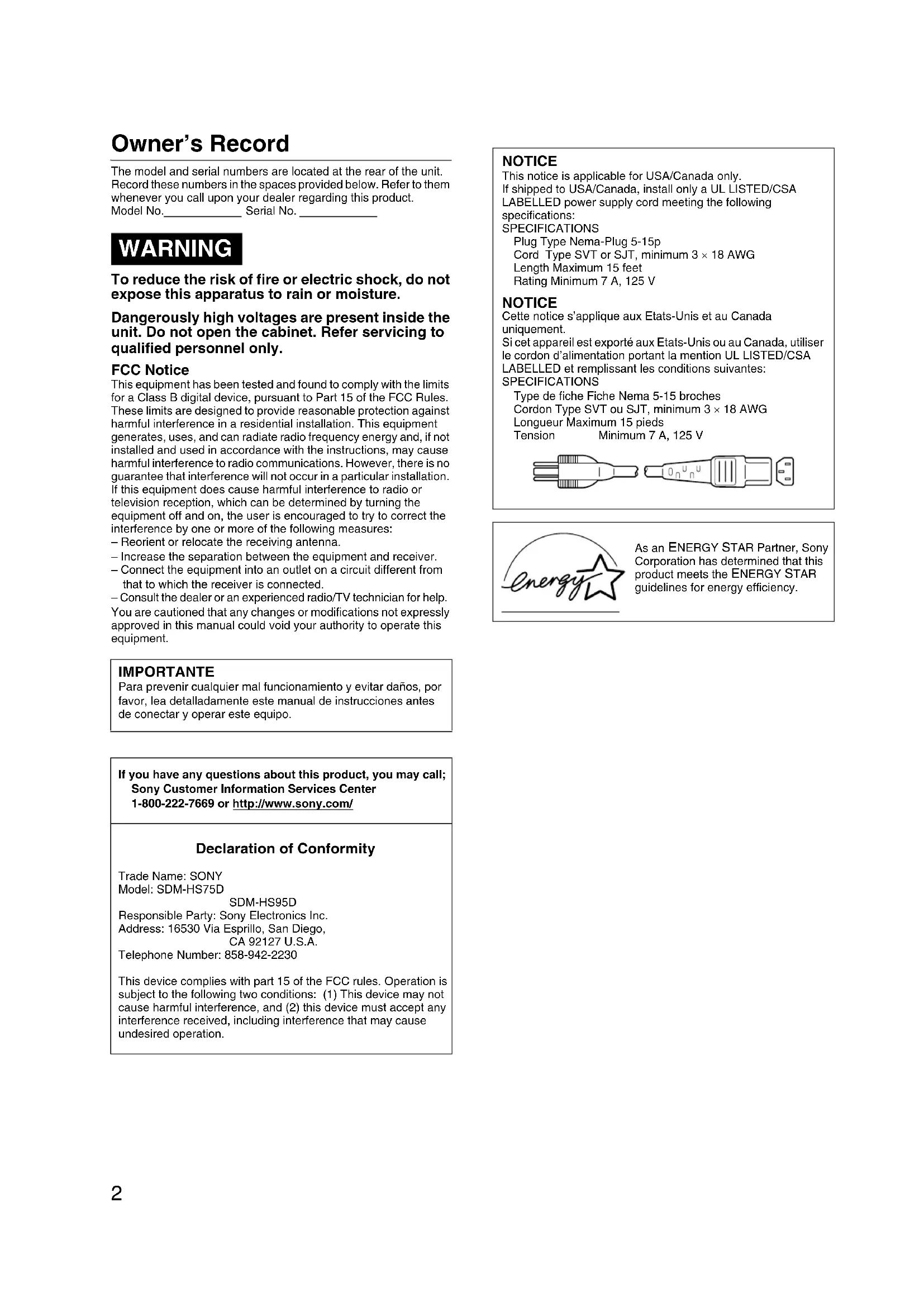 - A függőleges kioltás szélességének meg kell haladnia a 450 µs-ot. A kialakítás és a műszaki adatok külön értesítés nélkül változhatnak.Instrukcja obsługi 2-651-717-12(1) © 2005 Sony Corporation TFT LCD Color Computer Display SDM-HS75D SDM-HS95D PL2 Owner’s Record The model and serial numbers are located at the rear of the unit. Record these numbers in the spaces provided below. Refer to them whenever you call upon your dealer regarding this product. Model No. Serial No. To reduce the risk of fire or electric shock, do not expose this apparatus to rain or moisture. Dangerously high voltages are present inside the unit. Do not open the cabinet. Refer servicing to qualified personnel only. FCC Notice This equipment has been tested and found to comply with the limits for a Class B digital device, pursuant to Part 15 of the FCC Rules. These limits are designed to provide reasonable protection against harmful interference in a residential installation. This equipment generates, uses, and can radiate radio frequency energy and, if not installed and used in accordance with the instructions, may cause harmful interference to radio communications. However, there is no guarantee that interference will not occur in a particular installation. If this equipment does cause harmful interference to radio or television reception, which can be determined by turning the equipment off and on, the user is encouraged to try to correct the interference by one or more of the following measures: – Reorient or relocate the receiving antenna. – Increase the separation between the equipment and receiver. – Connect the equipment into an outlet on a circuit different from that to which the receiver is connected. – Consult the dealer or an experienced radio/TV technician for help. You are cautioned that any changes or modifications not expressly approved in this manual could void your authority to operate this equipment. WARNING IMPORTANTE Para prevenir cualquier mal funcionamiento y evitar daños, por favor, lea detalladamente este manual de instrucciones antes de conectar y operar este equipo. If you have any questions about this product, you may call; Sony Customer Information Services Center 1-800-222-7669 or http://www.sony.com/ Declaration of Conformity Trade Name: SONY Model: SDM-HS75D SDM-HS95D Responsible Party: Sony Electronics Inc. Address: 16530 Via Esprillo, San Diego, CA 92127 U.S.A. Telephone Number: 858-942-2230 This device complies with part 15 of the FCC rules. Operation is subject to the following two conditions: (1) This device may not cause harmful interference, and (2) this device must accept any interference received, including interference that may cause undesired operation. NOTICE This notice is applicable for USA/Canada only. If shipped to USA/Canada, install only a UL LISTED/CSA LABELLED power supply cord meeting the following specifications: SPECIFICATIONS Plug Type Nema-Plug 5-15p Cord Type SVT or SJT, minimum 3 × 18 AWG Length Maximum 15 feet Rating Minimum 7 A, 125 V NOTICE Cette notice s’applique aux Etats-Unis et au Canada uniquement. Si cet appareil est exporté aux Etats-Unis ou au Canada, utiliser le cordon d’alimentation portant la mention UL LISTED/CSA LABELLED et remplissant les conditions suivantes: SPECIFICATIONS Type de fiche Fiche Nema 5-15 broches Cordon Type SVT ou SJT, minimum 3 × 18 AWG Longueur Maximum 15 pieds Tension Minimum 7 A, 125 V As an ENERGY STAR Partner, Sony Corporation has determined that this product meets the ENERGY STAR guidelines for energy efficiency.Spis treści