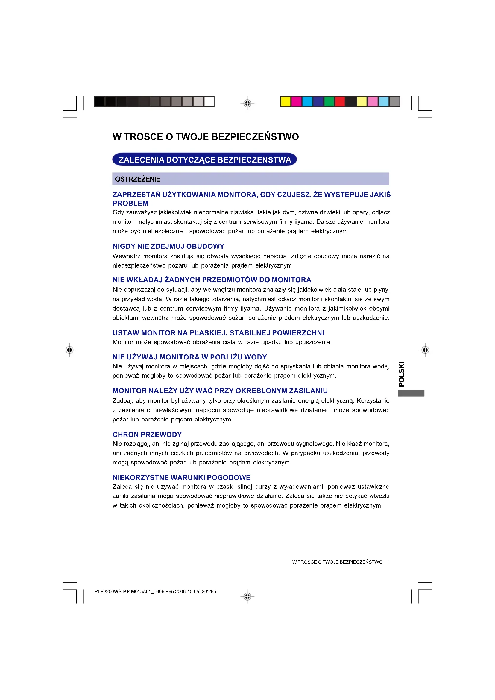 Bardzo dziêkujemy za wybranie monitora LCD firmy iiyama. Zalecamy, abyœ poœwiêci³ kilka minut i dok³adnie przeczyta³ tê krótk¹, lecz wyczerpuj¹c¹ instrukcjê, zanim zainstalujesz i w³¹czysz monitor. Przechowuj tê instrukcjê w bezpiecznym miejscu do wykorzystania w przysz³oœci. NEDERLANDS POLSKI ITALIANO PLE2200WS-Plk-M015A01_0906.P65 2006-10-05, 20:261POLSKI
