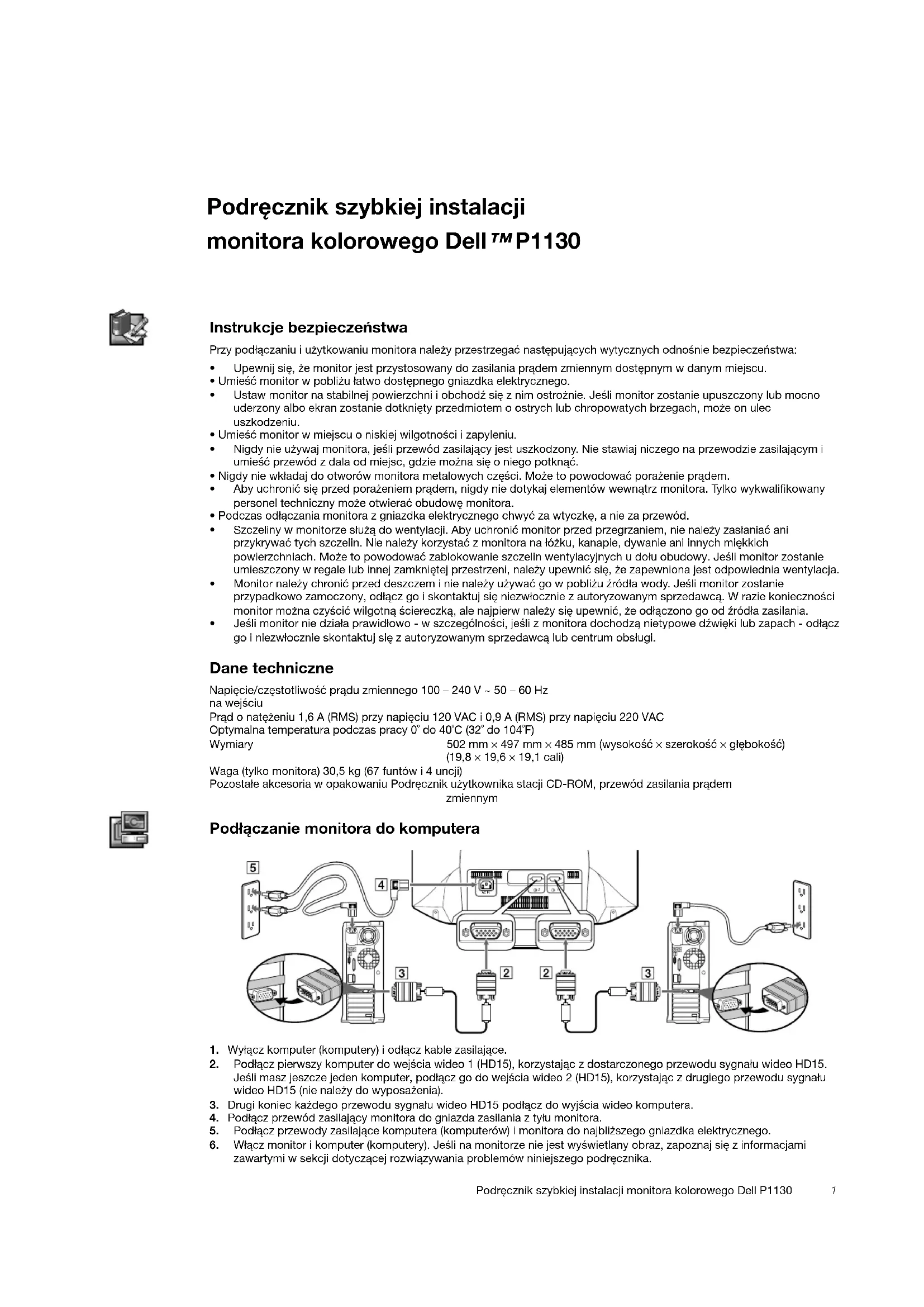 UWAGA: Wszystkie informacje dotyczące gwarancji oraz informacje prawne odnośnie monitora znajdują się w Podręczniku użytkownika na dysku CD.Pyководcтво по быcтpой ycтaновкe монитоpa Dell P1130